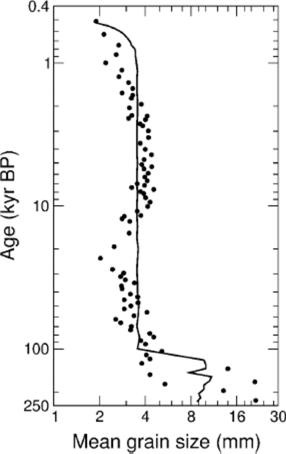 All these comments suggest that expressions much more complex than Equation (4) with K = const. and Expression (5) are needed, in order to reproduce realistically the evolution of grain-size in polar ice cores. Such improved expressions should slow down grain-boundary migration and retard the onset of polygonization, tending to promote a time-dependent grain-growth rate as well as the marked reduction in mean grain-size observed in GRIP and GISP2 ice cores during the Last Glacial Maximum, about 21 kyr BP (Reference PatersonPaterson,1991; Reference GowGow and others 1997; Reference ThorsteinssonThorsteinsson, 1996).