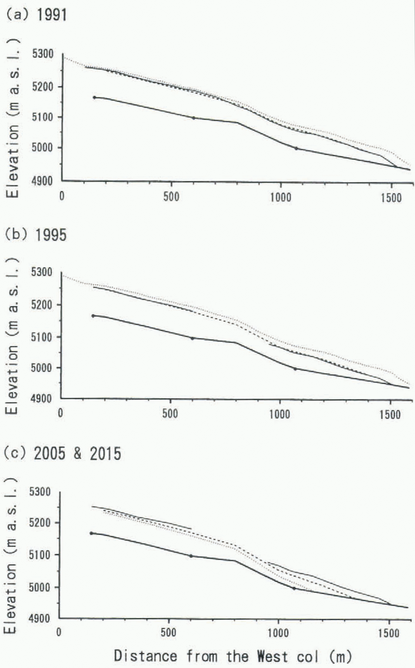 Fig. 5. Longitudinal surface profiles along the center line of glacier AX010. (a, b) measured (solid hue) and calculated (broken line) in l99l (a) and 1995 (b), the dotted line indicating the measured profile in 1978. and (c) calculated for the years 2005 (broken line) and 2015 (dotted line). The measured profile in 1995 (thin solid line) is also shown for comparison. The thick solid line shows an estimated bed profile based on the radio-echo sounding data in 1995 (solid circles).