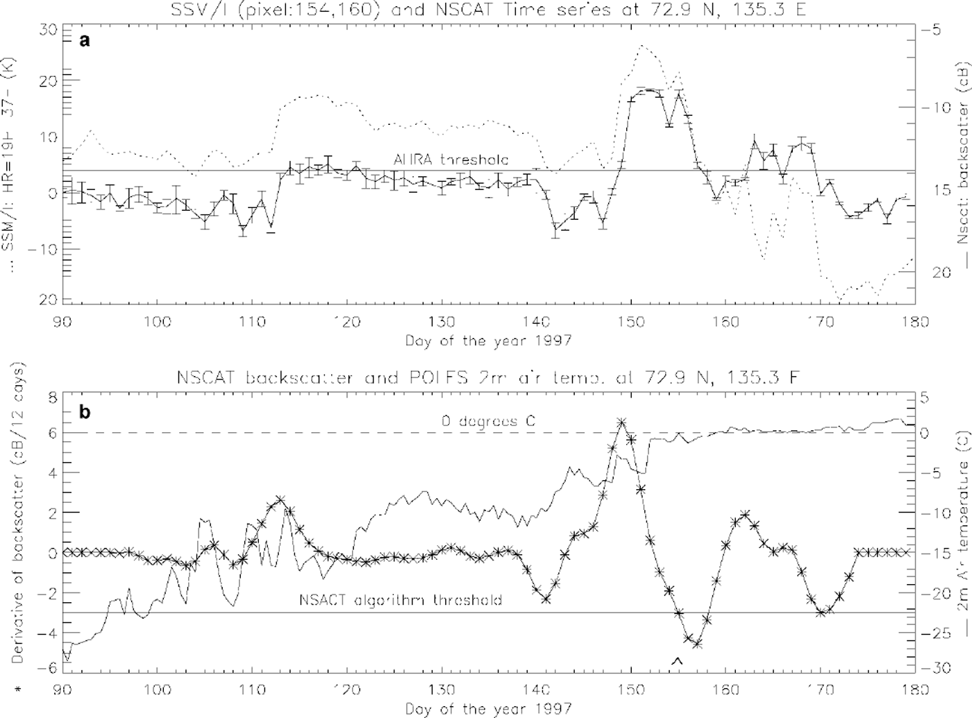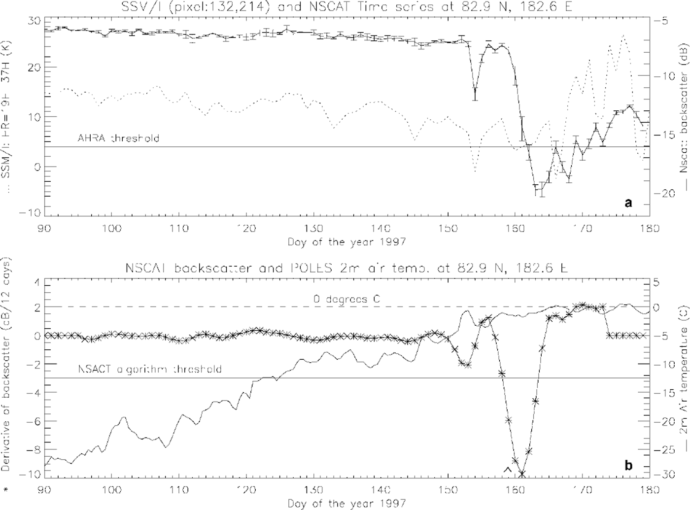 Recently the algorithm has been enhanced to take advantage of the time-series nature of the SMMR and SSM/I datasets (Drobot and Anderson, in press). The advanced horizontal-range algorithm (AHRA) first considers a day as a melt-onset event if the HR is <4.0 K. If HR is also less than −10.0 K then the day is considered the melt-onset date. If the HR value is between 4.0 and −10.0 K then the AHRA computes the range in HR values over the 10 days prior to the candidate onset day by subtracting the maximum and minimum HR values over these 10 day windows. In the same way the range in HR values over the period from the candidate day to 9 days later is computed. The range for the two time periods is compared. If the range after the potential melt day is 7.5 K greater than the range in HRover the 10 days prior to the candidate day then this day is assigned as the melt-onset date. The AHRA is implemented for each sea-ice pixel, producing a melt-onset map of the Arctic. Results of the AHRA using the SSM/I data for the 1997 melt onset are presented below for comparison with NASA scatterometer (NSGAT) observations of snowmelt onset.