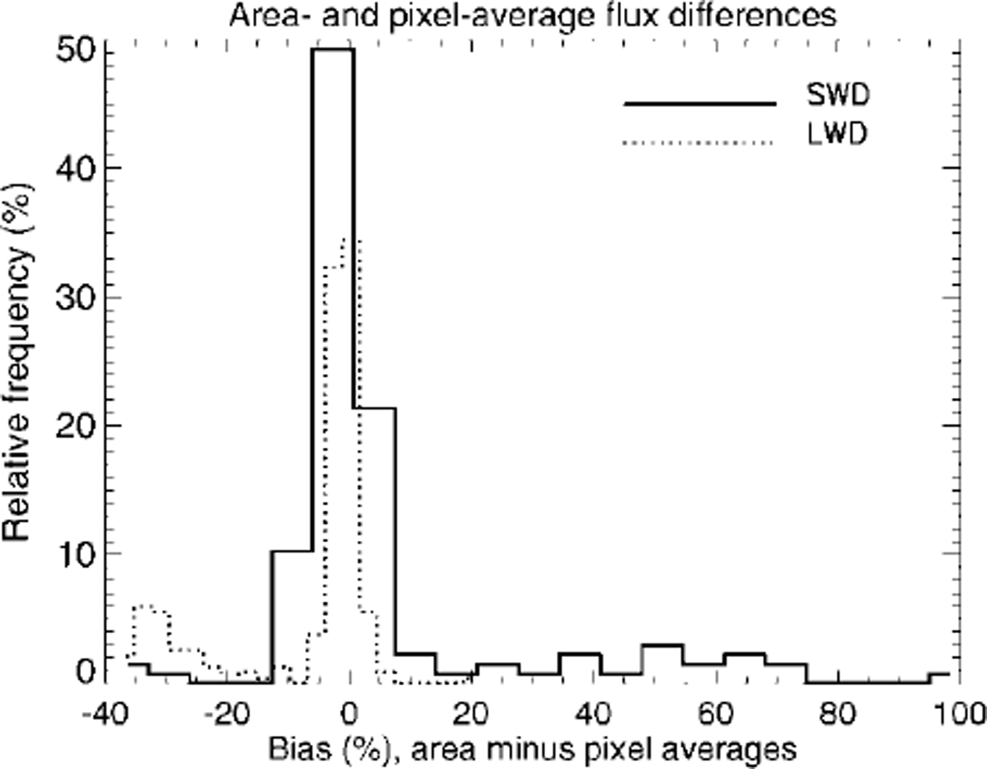 Fig. 5. Relative frequency of flux differences for the area-average and pixel-average flux computations. values shown are for the period september 1997−august 1998. downwelling short- and longwave radiation fluxes are denoted by swd and lwd, respectively