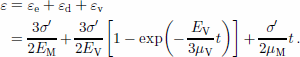 In Equation (1), EM is Young’s modulus, EV and μV are elastic modulus and viscosity, respectively, associated with primary (transient) creep, and μM is viscosity related to steady creep. t is time after loading with the constant stress deviator σ'.