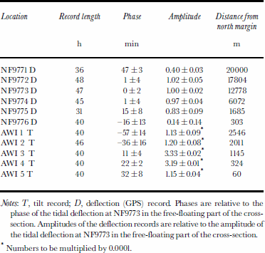 Table 1. Phase (positive as lag) and amplitude of tidal records measured 15–17 August 1997 in a cross-section of Nioghalvfjerdsfjorden glacier derived by cross-spectral analysis (Reference Reeh, Mayer, Olesen, Christensen and ThomsenReeh and others, 2000)