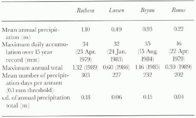 Figure 5 provides histograms of the daily precipitation totals at the four sites, giving an indication of the frequency of different daily intensities. All four sites are dominated by very light daily falls of snow, which is in agreement with the subjective observations of snowfall made at Rothera as part of the synoptic reporting programme (Turner and others, 1995). Larger daily totals of precipitation are more common on the western side of the Peninsula, and the Bryan Coast in fact receives more daily falls of20 mm than Rothera. This is probably a result of the rapid rise in orography discussed above. On the eastern side of the barrier there is an even greater preponderance of slight precipitation, the Room-Ice Shelf in particular having very few daily falls of more than 5 mm, no doubt a result of its location well removed from the main depression tracks.