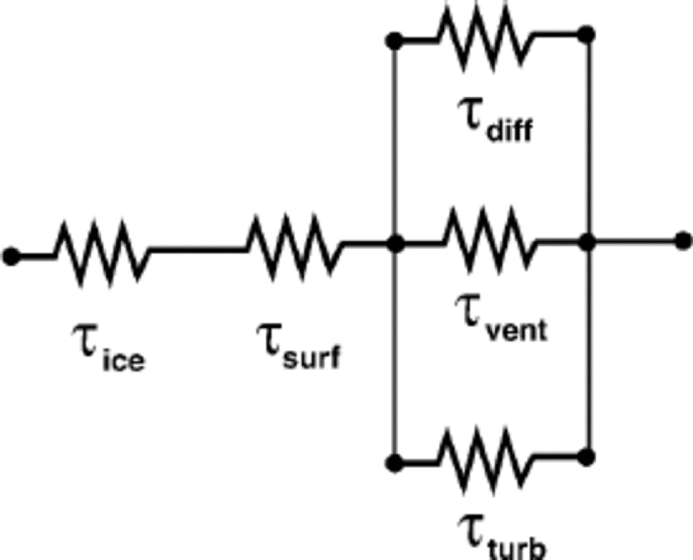 Here, we closely follow the method ofReference Waddington, Cunningham, Harder, Wolff and BalesWaddington and others (1996) to estimate the characteristic times for the relevant processes that can impede equilibration of stable isotopes. They showed that, as a series resistor, τsurf is typically too short to limit equilibration, and turbulent wind pumping τturb is too long in comparison to molecular diffusion and topographic ventilation times, with which it works in parallel, to affect equilibration rate. Therefore we restrict our analysis to the remaining three processes represented by τice , τdiff and τvent.