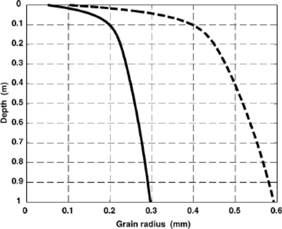 Fig. 2 Solid curve shows radius of snow grains in Antarctica, based on data by Reference Stephenson and ŌuraStephenson (1967) and Reference GowGow (1969). Larger grains (dashed curve) could be found at warmer or less windy sites, such as in parts of Greenland.