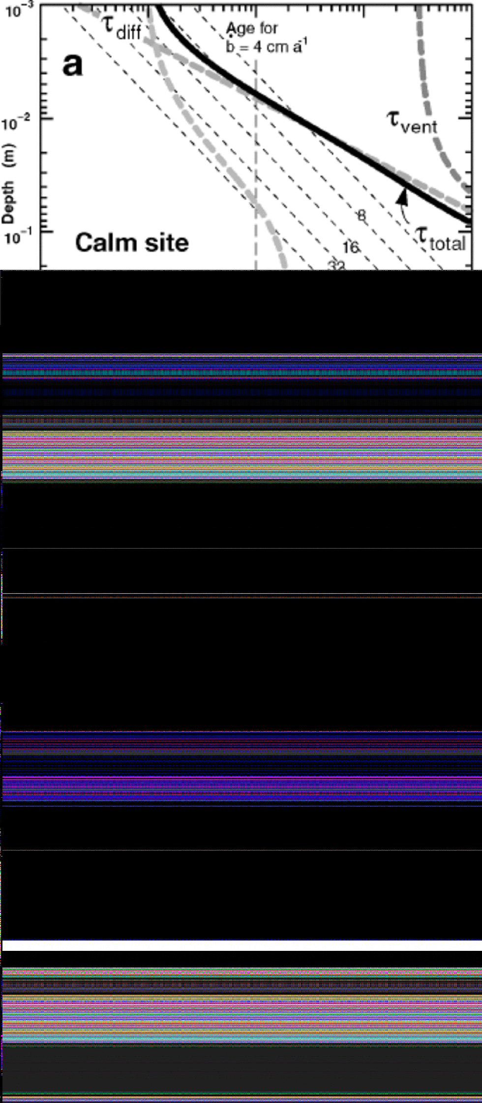 Forced ventilation has negligible impact on smoothing of seasonal isotopic variations in deep firn, due to the exponential increase of air-exchange time with depth in Equation (6). We take a conservative approach in adding this process; by applying the surface permeability to all depths, and using a relatively long airflow path along with the velocity at the deepest (and therefore slowest) point, we will tend to overestimate times required for equilibration, and to underestimate its importance.