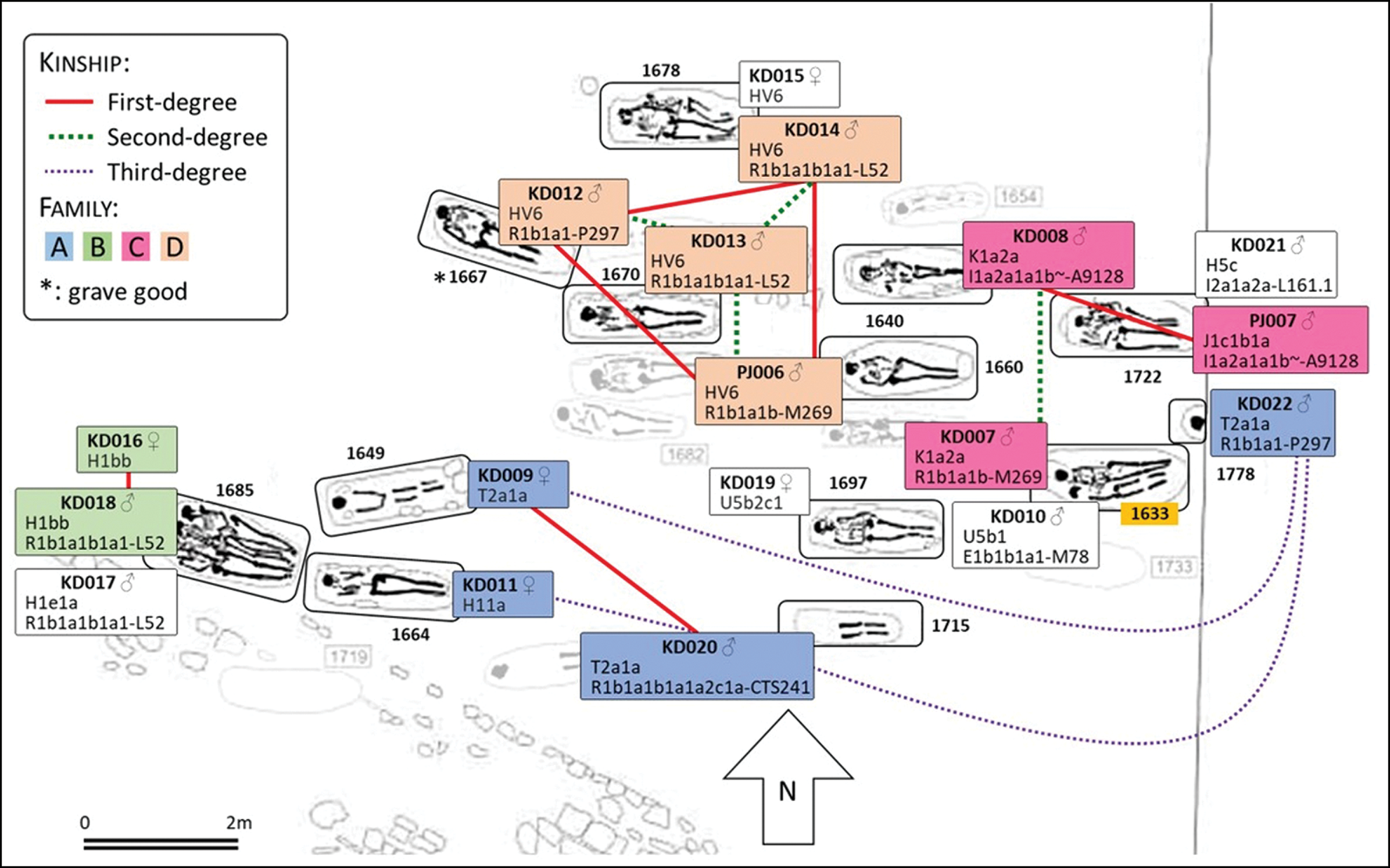 Family C (Figure S14): this family unit comprises three males from different graves. PJ007 (35–45-year-old, grave 1722) shares a first-degree relationship with KD008 (17–25 years old, grave 1640); as both carry the Y haplogroup I1a2a1a1b–A9128 but different mitochondrial genomes, a father–son relationship is suggested. KD008 is also second-degree related to KD007 (adult, double grave 1633), who has a different Y haplogroup but shares the K1a2a mitochondrial haplotype, suggesting that these two individuals could have been half-brothers or nephew and uncle.