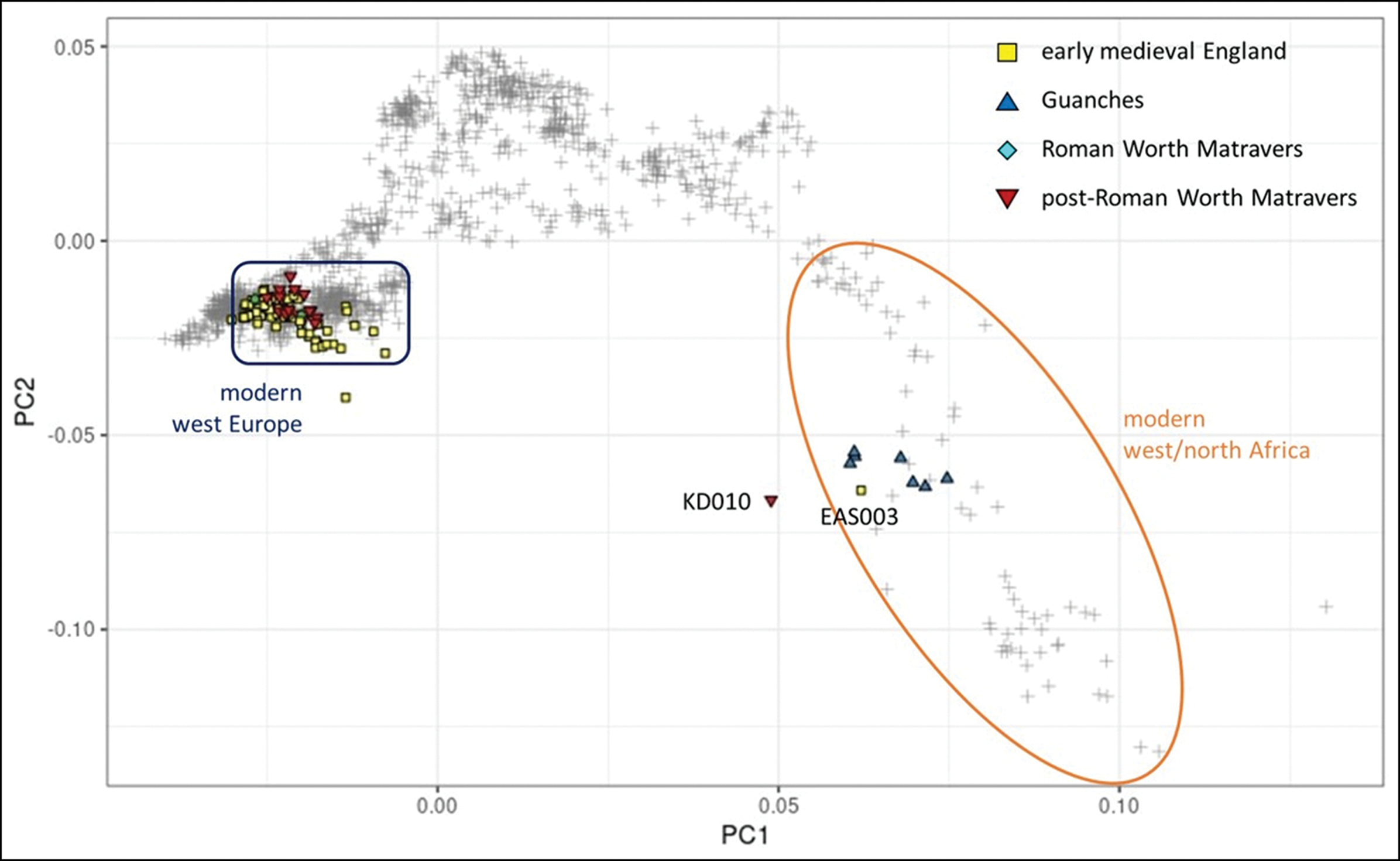 Figure 2. Principal component analysis displaying the Worth Matravers individuals, alongside other early medieval aDNA samples from England (yellow squares; Gretzinger et al. Reference Gretzinger2022) and contemporaneous North African individuals (blue triangles; seventh to eleventh centuries AD Guanches from the Canary Islands; Rodríguez-Varela et al. Reference Rodríguez-Varela2017). Modern samples (grey crosses) from West Eurasia and West/North Africa are shown in the underlying plot (figure by authors).