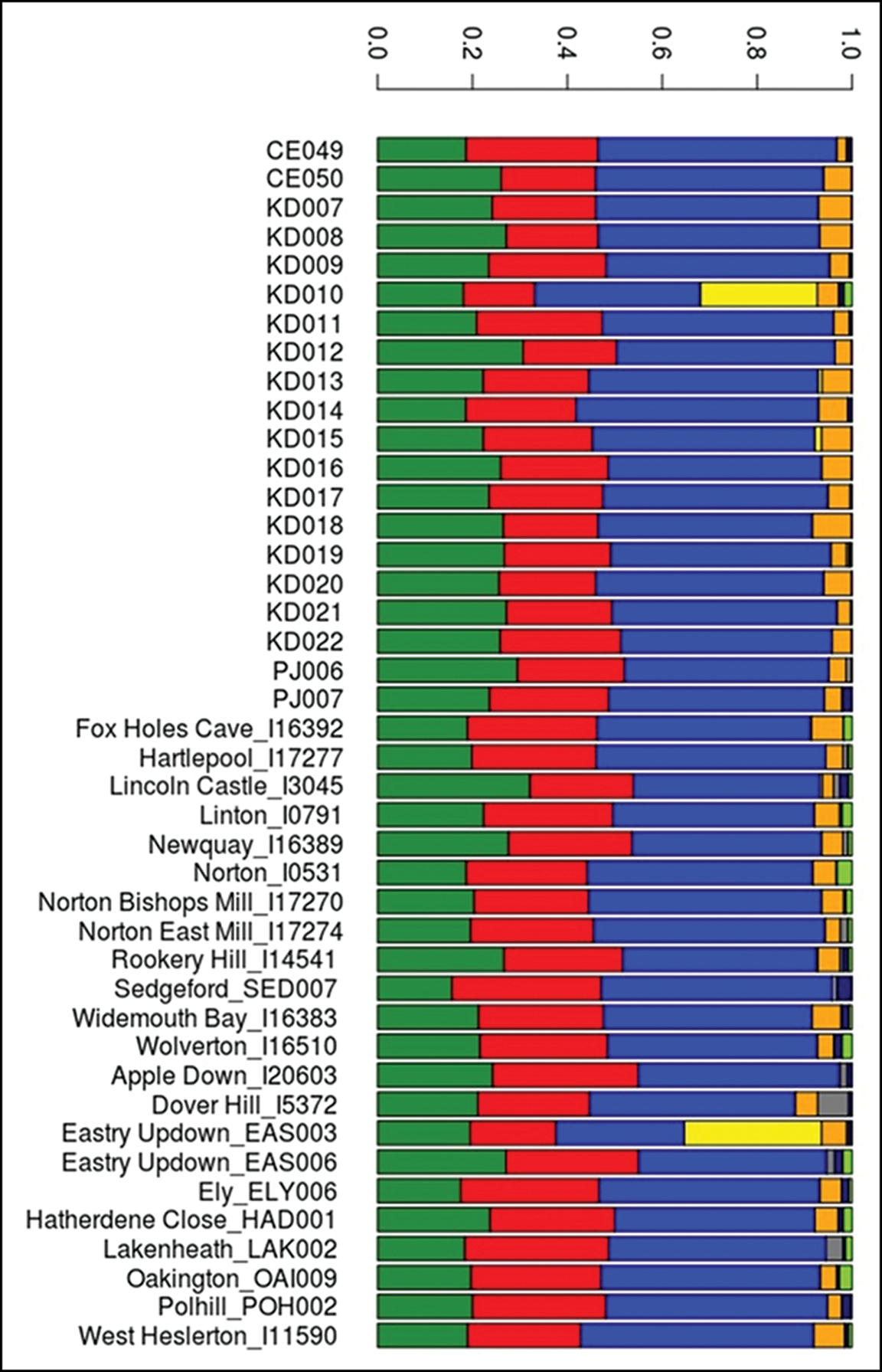 Figure 3. Unsupervised ADMIXTURE analysis at K = 8 (the number of assumed ancestral groups thought to have contributed to the genetic makeup of the tested populations; Alexander et al. Reference Alexander, Novembre and Lange2009), following the percentages shown in Table S4. Code numbers for Worth Matravers are taken from Table 1, and other codes are as listed in Gretzinger et al. (Reference Gretzinger2022). Most of the sample comprises three main components, characteristic of western European hunter-gatherers (blue), early European farmers (green), and Caucasus hunter-gatherers (red). KD010 (Worth Matravers) and EAS003 (Updown) stand out as the only individuals with a substantial yellow component, characteristic of West African populations. Smaller components are likely artefacts of DNA degradation (figure by authors).