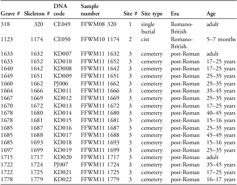 Table 1. Sample information for the 20 individuals sampled from the three sites at Worth Matravers. Grave and skeleton numbers from Ladle (Reference Ladle2018), and age estimates from Randall (Reference Randall and Ladle2018). More information in Table S1 .