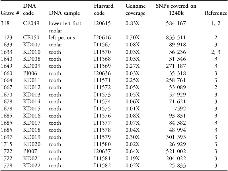 Detailed methods for DNA extraction, library preparation, sequencing, data processing and analysis are available in the OSM (section 4), and an overview of the autosomal data is shown in Table 2. We were able to determine the genetic sex of all 20 individuals. The two Roman individuals were both female, while the post-Roman cemetery included 13 males and five females (Table 3). Of the three double burials, both grave 1633 and grave 1722 contained two males, and grave 1678 contained one male and one female. The triple burial in grave 1685 contained two males and one female (Figure 1).