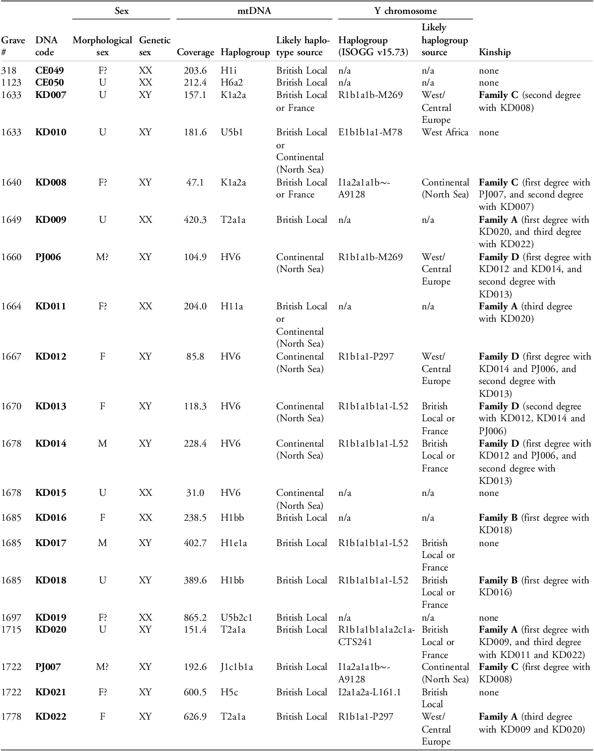 Table 3. Uniparental and kinship data from the Worth Matravers individuals, detailing genetic sex (XX female, XY male) alongside morphological sex determinations (Randall Reference Randall and Ladle2018 ), mitochondrial and Y-chromosome haplogroup assignment, likely sources of these uniparental lineages, and genetically identifiable family units with degrees of relatedness (Figure 1; OSM section 6).