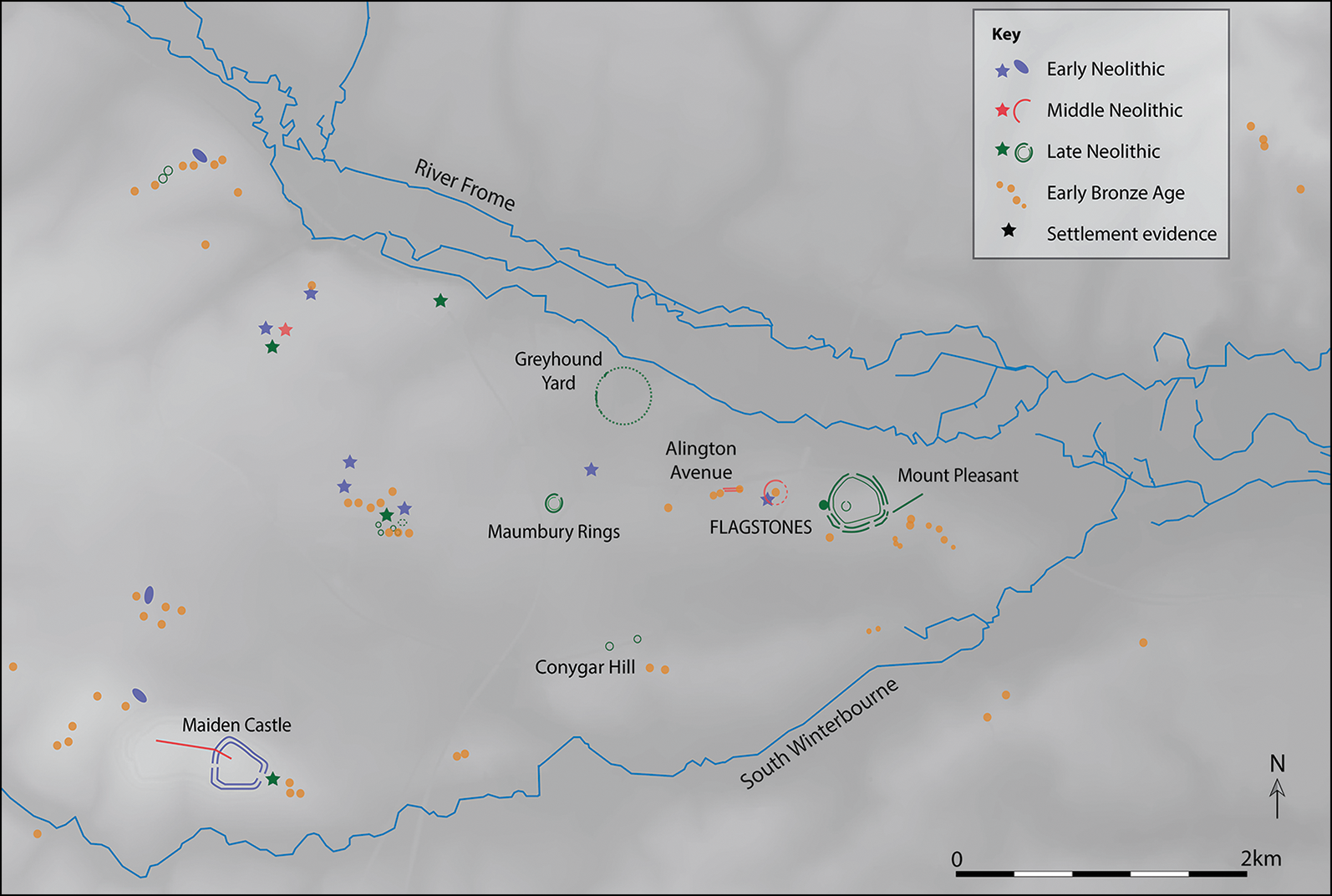Figure 1. Map showing the location of Flagstones within the wider Dorchester area; other Neolithic and Early Bronze Age monuments and settlement evidence in the area is also shown (figure by Susan Greaney).
