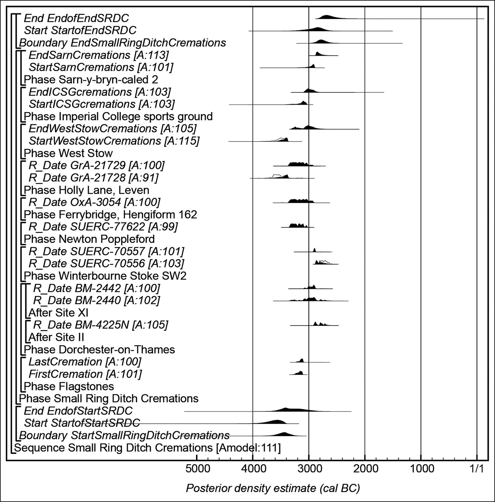 Figure 10 shows a model for the dating of cremations associated with ringforms. Overall, this activity started in 3960–3400 cal BC (95% probability; StartofStartSRDC), probably in 3700–3455 cal BC (68% probability), but the timescale of this start was drawn out, occurring over 1–875 years (95% probability; Figure S21). These monuments continued to be built until 3265–2605 cal BC (95% probability; StartofEndSRDC; Figure 10), probably 3020–2715 cal BC (68% probability). The creation of small circular enclosures associated with cremations was therefore a widespread and long-lasting practice of the Middle Neolithic, the association with larger circular enclosures such as Flagstones representing a mature, or even late, stage in the development of this tradition.