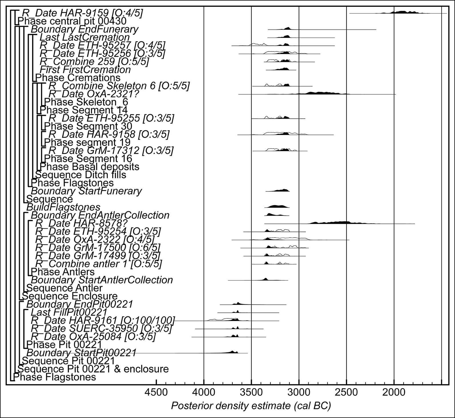Figure 3. Probability distributions of dates from Flagstones. Each distribution represents the relative probability that an event occurs at a particular time. For each of the dates two distributions have been plotted: one in outline, which is the result of simple radiocarbon calibration, and a solid one, based on the chronological model used. Distributions other than those relating to individual samples correspond to aspects of the model. For example, the distribution ‘StartFunerary’ is the estimated date when funerary activity began. The large square brackets down the left-hand side, along with the OxCal keywords, define the overall model exactly (figure by Peter Marshall).