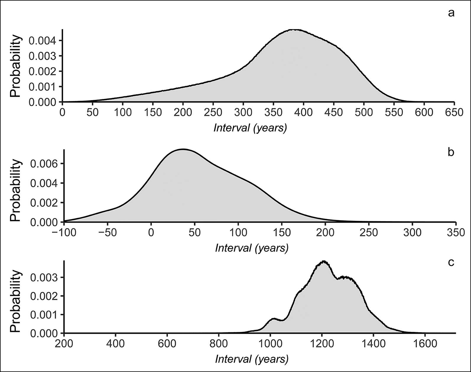 Figure 4. Intervals between episodes of activity at Flagstones, derived from the model defined in Figure 3: a) interval between the infilling of an early Neolithic pit (EndPit00221) and the construction of the circular enclosure (BuildFlagstones); b) duration of funerary activity; and c) interval between the end of Neolithic funerary activity (EndFunerary) and the interment of a young adult male in the centre of the enclosure (HAR-9159) (figure by Peter Marshall).