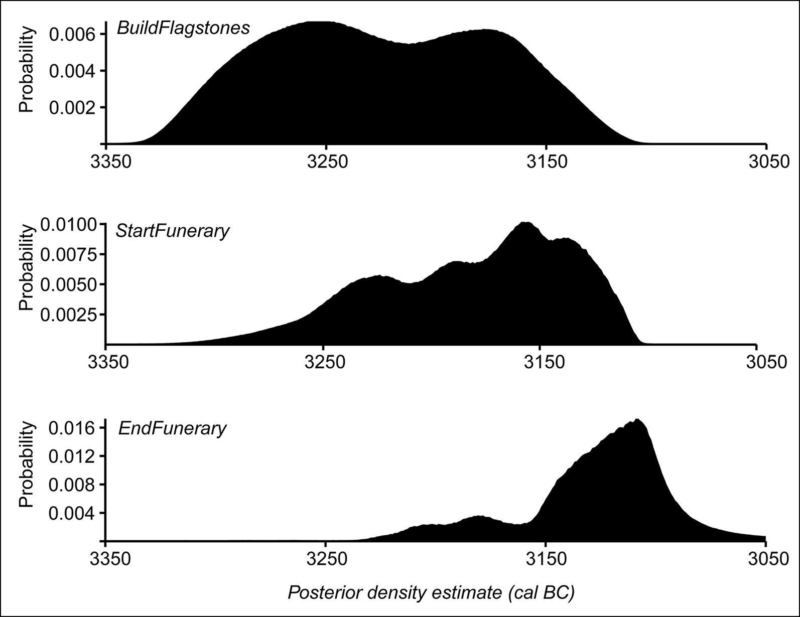 Figure 5. Probability distributions of dates for key events at Flagstones derived from the model defined in Figure 3 (figure by Peter Marshall).