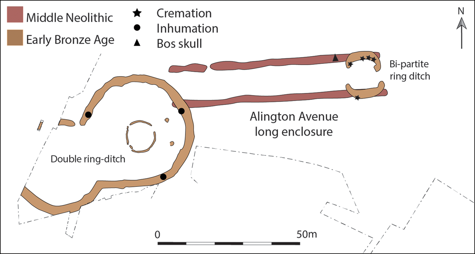The construction of Flagstones enclosure and its associated funerary activity, now dated to the thirty-third or thirty-second centuries cal BC, can be placed at the end of a sequence of earlier Neolithic activity in the Dorchester complex (Figure 7). Despite the circular form of the enclosure representing a dramatic shift away from linear constructions such as Alington Avenue, the segmented and intercutting pits, deposition of burials within the ditches and location in an area of previous activity all point to continuities of community and practice. It was the large and perfectly circular form of the earthwork enclosure and the interment of an adult cremation burial that were the innovative aspects of this monument.