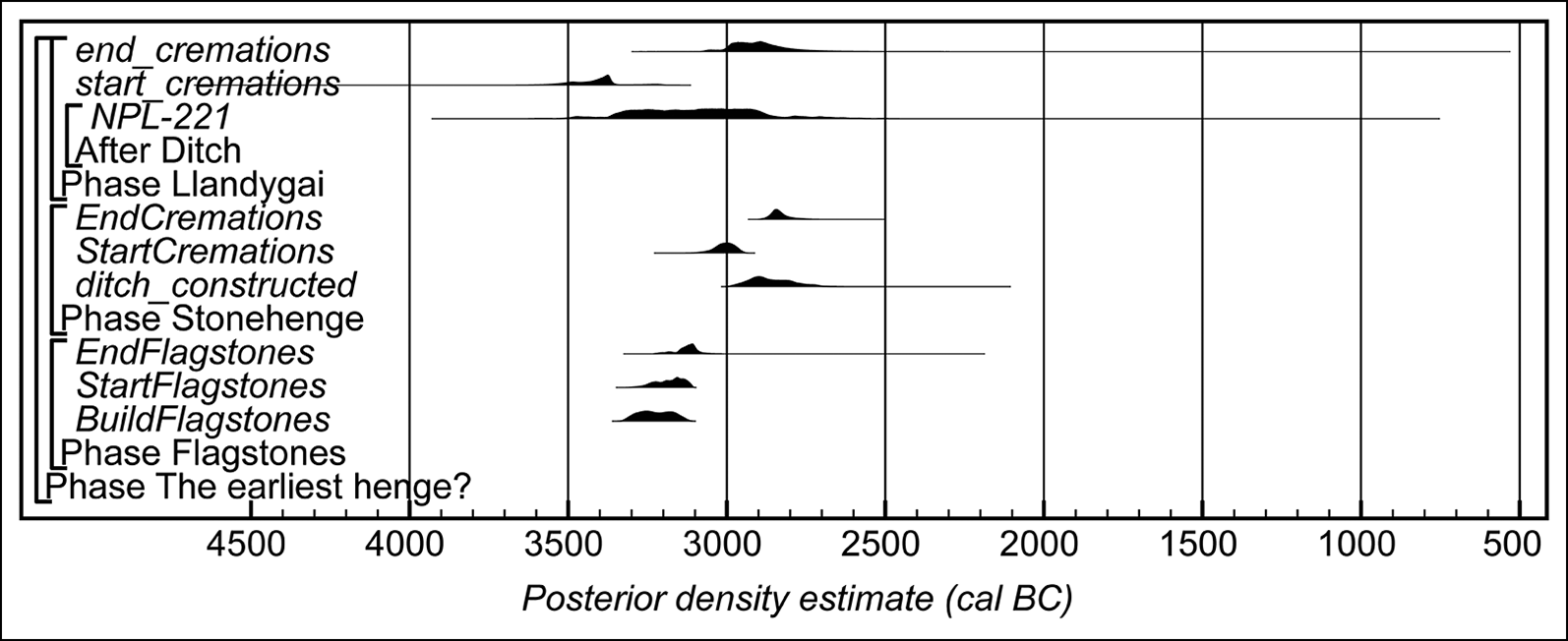 The placing of burials into the ditch and interior of Flagstones parallels funerary practices at other proto-henges. At Stonehenge, the cremated remains of at least 60 people were placed within and alongside the Aubrey Holes (a ring of 56 pits), into the ditch and on the bank (Willis et al. Reference Willis2016; Willis Reference Willis2021). The earliest of these cremation burials are estimated to include individuals who died in 3075–2945 cal BC (95% probability; StartCremations; Figure S12), probably in 3035–2970 cal BC (68% probability), while the latest include individuals who died in 2890–2765 cal BC (95% probability; EndCremations; Figure S12), probably in 2870–2715 cal BC (68% probability).