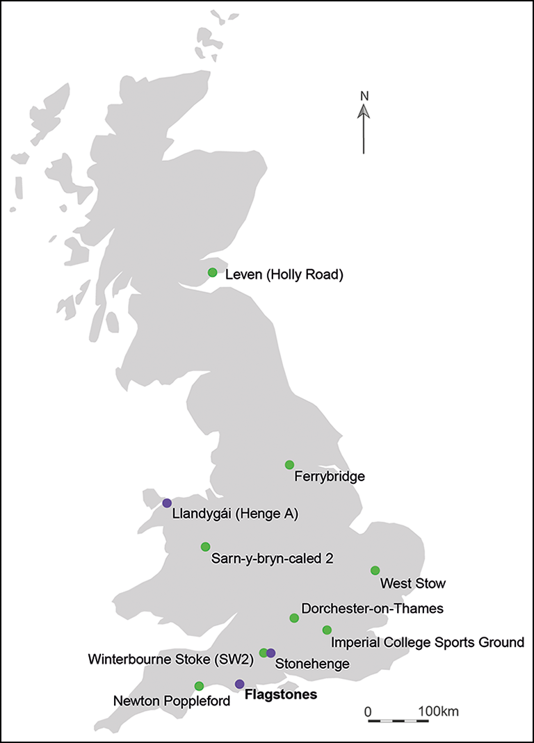 Flagstones is a 100m-diameter, circular enclosure of unevenly spaced and partially intercutting pits, created in an area of previous Early Neolithic activity. It is located in Dorchester, in the county of Dorset in south-west England (Figures 1 & 2; Smith et al. Reference Smith, Healy, Allen, Morris, Barnes and Woodward1997). There is no direct evidence for enclosure banks. However, pit fills contain equal amounts of chalk rubble from both sides, suggesting that the upcast from the pits was used to form both an inner and outer bank. The first key question for the research was, what date was this enclosure constructed? At least four burials were placed on the base or in the primary fills of the enclosure pits: a cremated adult under a large sarsen stone, and the inhumations of three young children, one of which was under a large slab of calcareous sandstone (Smith et al. Reference Smith, Healy, Allen, Morris, Barnes and Woodward1997: 37). Three further cremations of adults were interred in pits within a penannular ditch (shaped like a ring with a small gap in its circumference) in the south-west part of the enclosure (Figure 2; Smith et al. Reference Smith, Healy, Allen, Morris, Barnes and Woodward1997: 41). Over what period was Flagstones used for burial? The enclosure lies at the centre of a major monument complex in the Dorchester area, which developed over 2000 years during the Neolithic and Early Bronze Age. Parts of this complex are now well dated (Whittle et al. Reference Whittle, Healy and Bayliss2011: 164–93; Greaney et al. Reference Greaney2020). The inner ditch of the causewayed enclosure at Maiden Castle was constructed in 3660–3635 cal BC (7% probability; Table S2) or 3570–3525 cal BC (88% probability) and the major henge monument of Mount Pleasant was built in 2615–2495 cal BC (95% probability: Table S4). Where does Flagstones fit within the chronology of this wider complex? Looking more broadly at ‘proto-henges’, how does the date of the construction and funerary use of Flagstones compare to Stonehenge and Llandygái, and to other comparable monuments, including small, penannular or circular enclosures associated with cremations?