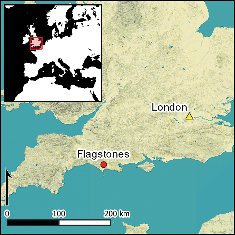 These Middle Neolithic circular monuments appear to herald the start of a preference for building round monuments, including stone circles, timber structures and earthwork henges. They were built at a time when relatively few large-scale monuments were constructed, in comparison to the earlier and later Neolithic, and yet their segmented ditches and the patterns of deposition at some sites—for example, the placement of animal bone in ditches—hark back to practices at earlier causewayed enclosures (Cleal et al. Reference Cleal, Walker and Montague1995: 113–14). The chronology of these proto-henges is therefore essential to understanding the trajectories of changing ceremonial and funeral monuments in Britain. Three similar monuments form key comparators: Flagstones in Dorset, the earliest phase of Stonehenge in Wiltshire, and Llandygái ‘Henge’ A in Gwynedd, all of which have been partially excavated. Although the enclosure at Stonehenge has been precisely dated by a programme of radiocarbon dating and Bayesian modelling (Darvill et al. Reference Darvill, Marshall, Pearson and Wainwright2012) and there are 10 radiocarbon dates available on cremation burials from Llandygái ‘Henge’ A and its associated segmented pit circle (see below), only six radiocarbon dates are available for Flagstones, obtained on material from the 1986–1987 excavations (Smith et al. Reference Smith, Healy, Allen, Morris, Barnes and Woodward1997: tab. 1; see online supplementary material (OSM) Table S1). Three of these dates provide a broad estimate that the monument was constructed in the later fourth or early third millennium cal BC. Here, we present a new chronology for Flagstones, seeking to answer key questions about this monument and the broader category of proto-henges.