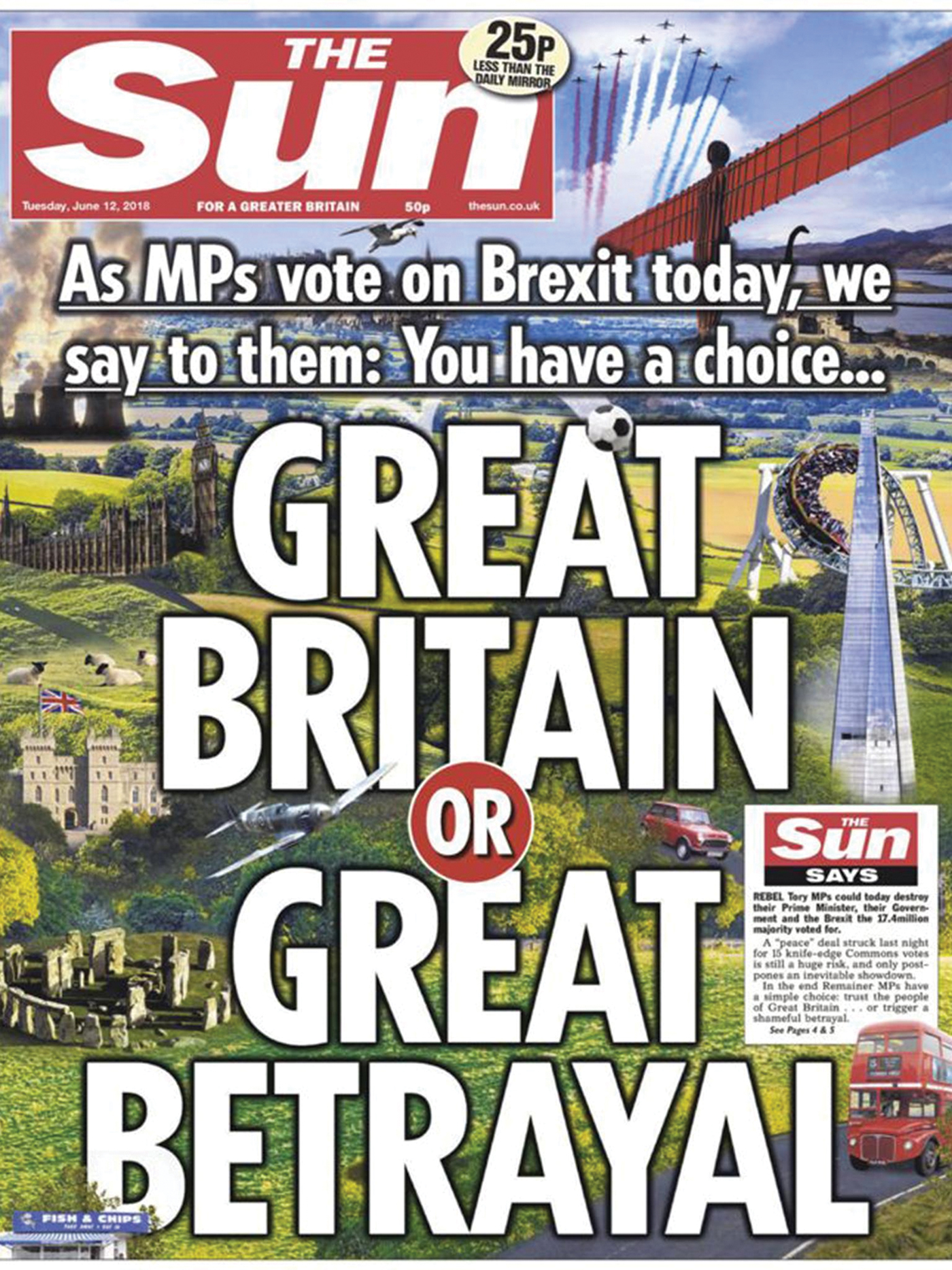 Figure 1. ‘Great Britain or great betrayal?’ Front page of The Sun, 12 June 2018. A collage of British icons on a background of rolling hills. Clockwise from top right: the Red Arrows, the Angel of the North, the Loch Ness monster, football, Alton Towers, the Shard, a Mini Cooper, a London double-decker bus, a fish and chip shop, Stonehenge, a Spitfire, Windsor Castle, Westminster Palace, Ferrybridge power station and a seagull. (Image copyright The Sun, and News Licensing and News UK, published under non-commercial fair use, after requesting permission 11 September 2018.)