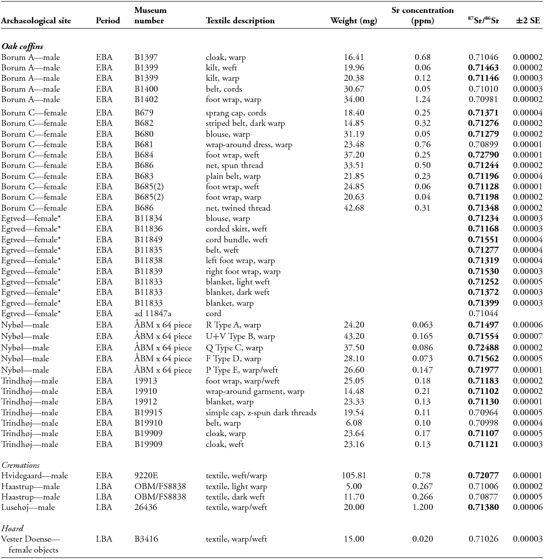Table 1. Strontium isotope results of Bronze Age wool textiles from Denmark (non-local values are indicated in bold).