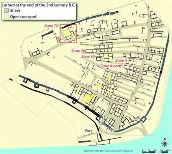 The possible ‘tavern’ was discovered during excavation of occupation levels dating to the second and first centuries BC in zone 75 (Figure 2). The structure was strategically located at the intersection of two important streets of the settlement, as well as at one of the entrances to the town in the northern ramparts. For the period c. 125–75 BC (phase 75C2), a relatively large complex of rooms occupied zone 75, oriented around a central courtyard. This structure continued to be occupied between 75 and 50 BC (phase C1), although it no longer appears to have been specifically used as a tavern. After 50 BC, the entire courtyard structure was torn down and a number of public buildings were erected in its place.