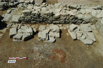 Even more importantly, a large deposit of animal bones was found in a thin layer of soil covering the river pebbles in the courtyard, probably corresponding with refuse disposal towards the end of the structure's occupation (Figure 8). According to preliminary faunal analysis, these bones represent pieces of dismembered cow and sheep carcasses. Rather than representing the remains of an entire carcass, they are instead from specific cuts of meat, probably associated with food preparation for a relatively large number of people.