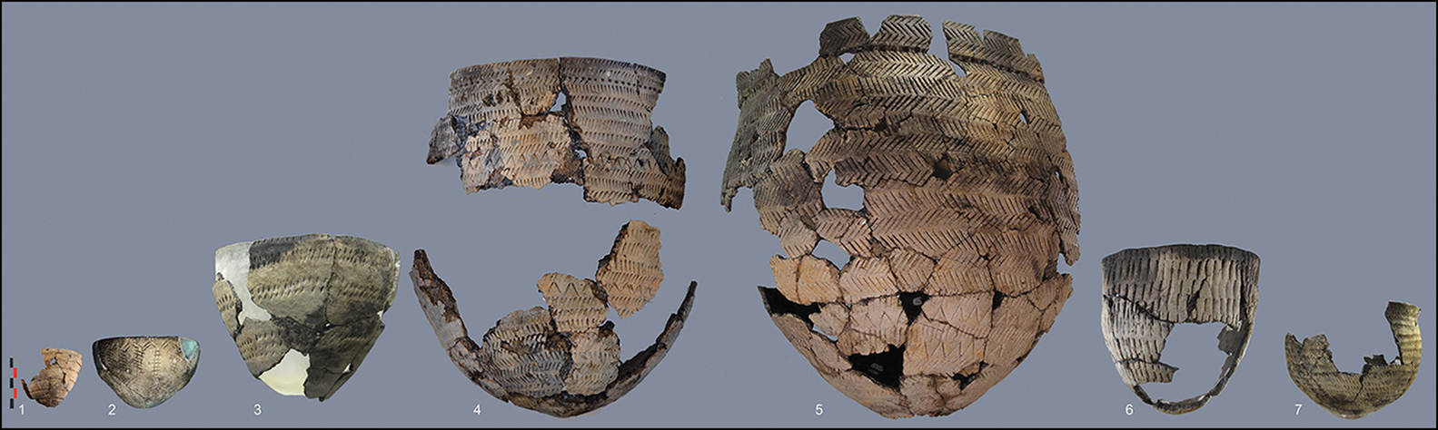 Figure 4. Pottery from the Serteya II: 1, 4 & 7) Zhizhitsa Culture; 2 & 5–6) Eneolithic ‘Serteya VIII’ ceramics; 3) Usviaty Culture; scale in cm (prepared by E. Dolbunova).