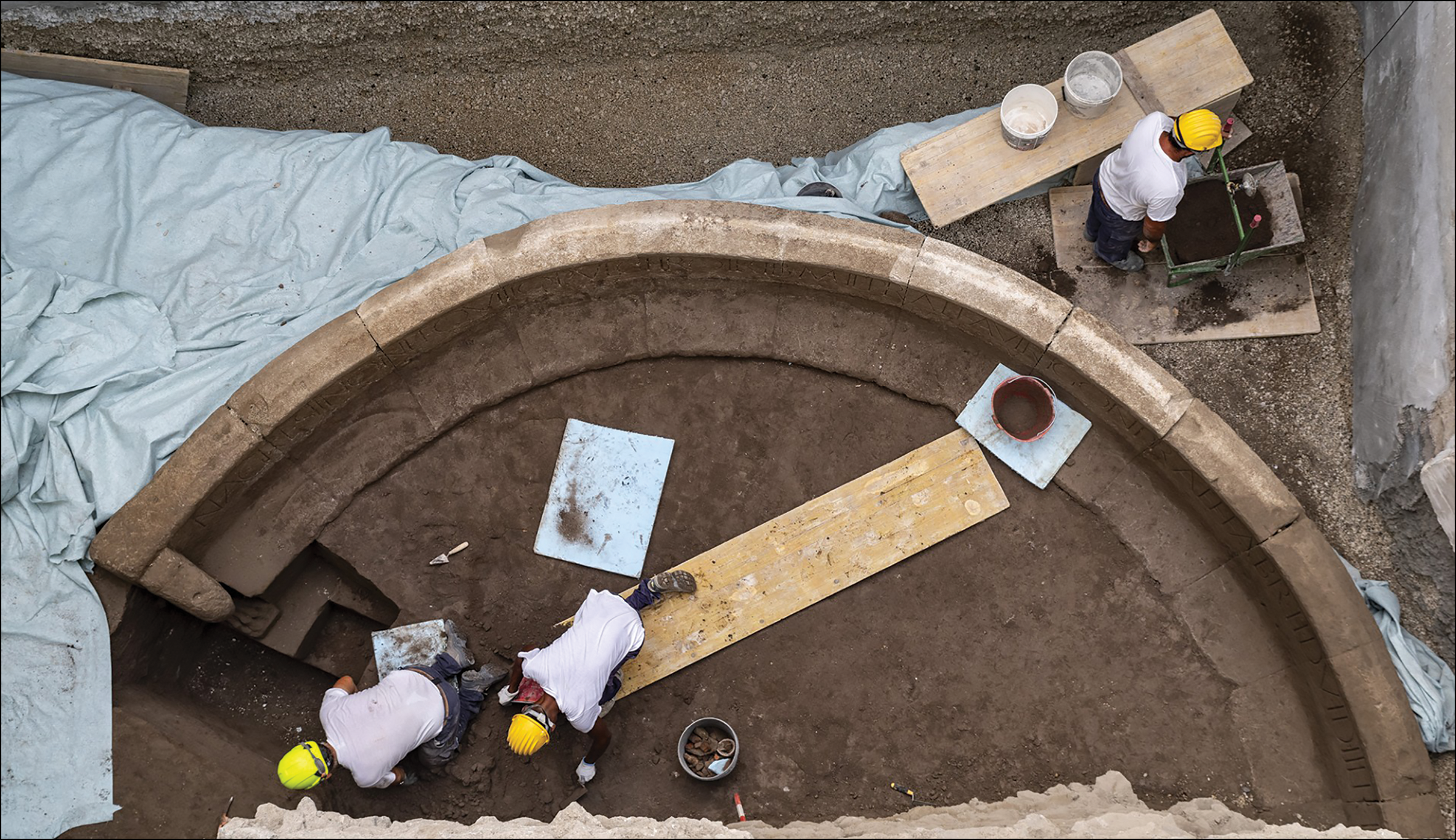 Frontispiece 1. Excavation of a ‘schola' tomb discovered during work on the Pompeii Archaeological Park library building. The monument, dated to the Augustan period (27 BC–AD 14) is dedicated to Numerius Agrestinus; an inscription details his life and career. Among his various titles and roles, Agrestinus was a military tribune, prefect of the Autrygoni (a previously undocumented title), prefect of the engineers and was twice elected to the position of duumvir, one of the city’s two leading magistrates. Unusually, Agrestinus was already known from another funerary inscription erected by his wife, Veia Barchilla; the city council seems to have subsequently decided to honour Agrestinus with a second monument on public land. © Photograph courtesy of the Ministry of Culture-Pompeii Archaeological Park; reproduction prohibited.
