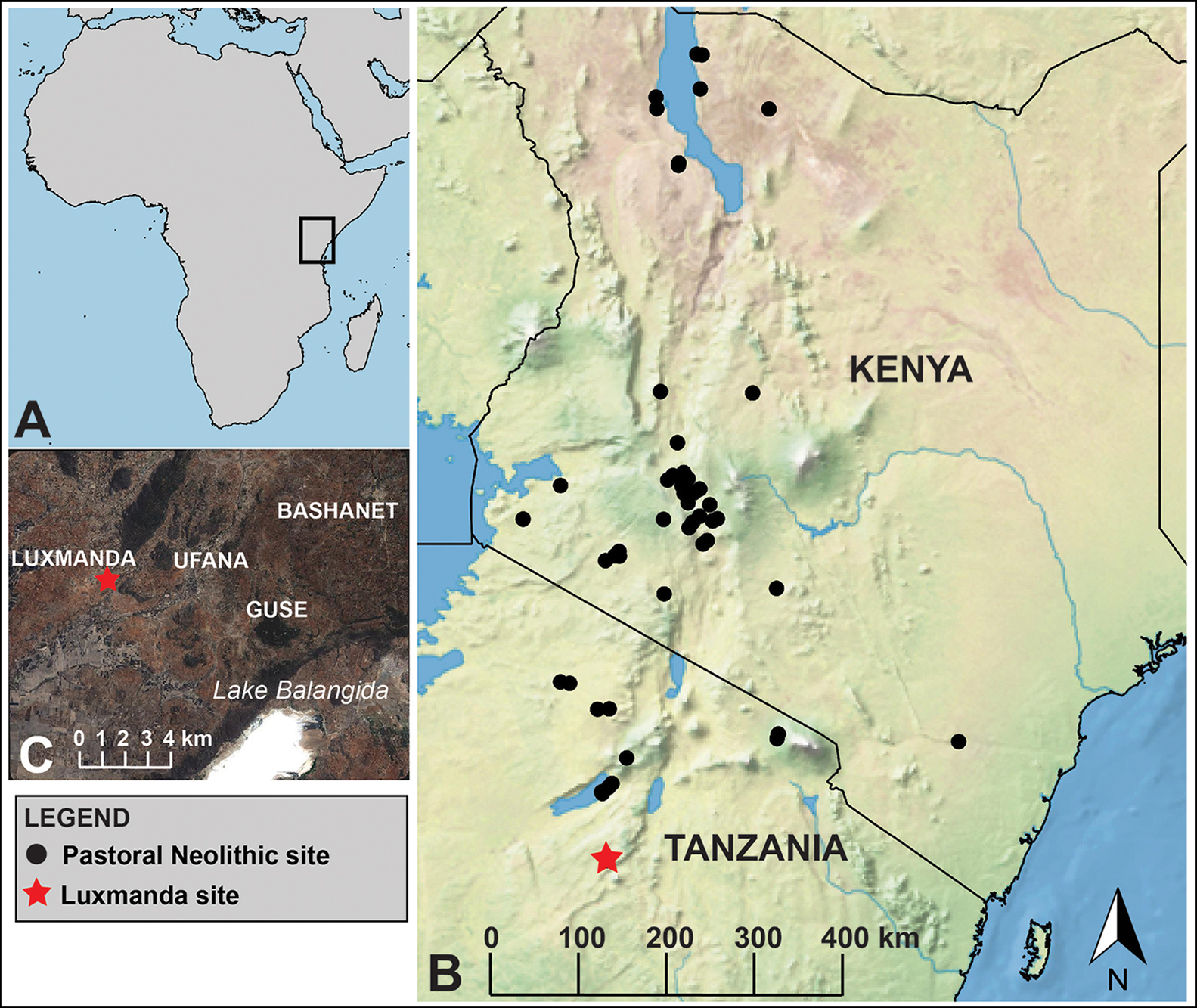Figure 1. Map of Africa (A), showing the study region with Pastoral Neolithic sites indicated by black dots (B) and detail of the Luxmanda area (C). Basemap in (B) produced with Natural Earth; basemap in (C) is SPOT 1.5 resolution imagery licensed to M.E. Prendergast courtesy of the Harvard University Center for Geographic Analysis; map by M.E. Prendergast.