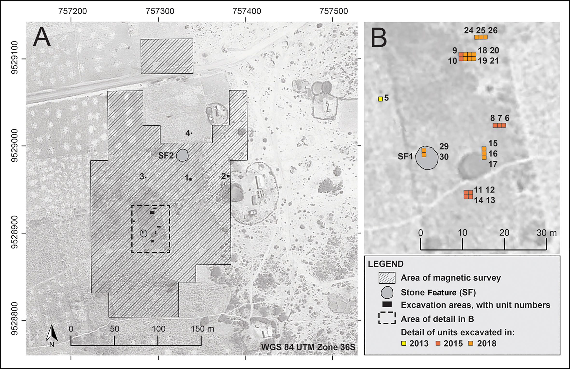 Prior to test excavations, we interviewed the landowners and several older residents of Luxmanda village about the stones. These informants had no prior knowledge of these features and did not view them as meaningful to the community within living memory. As cairns are a known feature of Pastoral Neolithic mortuary traditions, we proceeded with caution in a limited section of SF1 and placed a 4m2 trench. Given time constraints, the volume of cultural material found and the difficulty of excavation amongst stones, this area was reduced to 2m2 (units 29–30) and then 1m2 (unit 30).