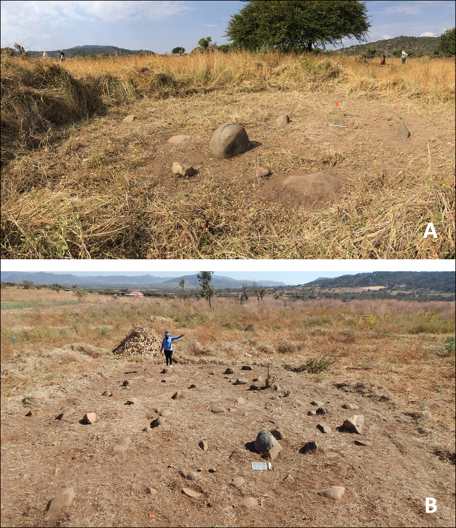 Figure 3. Stone Feature One prior to excavation (A) and the unexcavated Stone Feature Two (B); photographs by M.E. Prendergast.