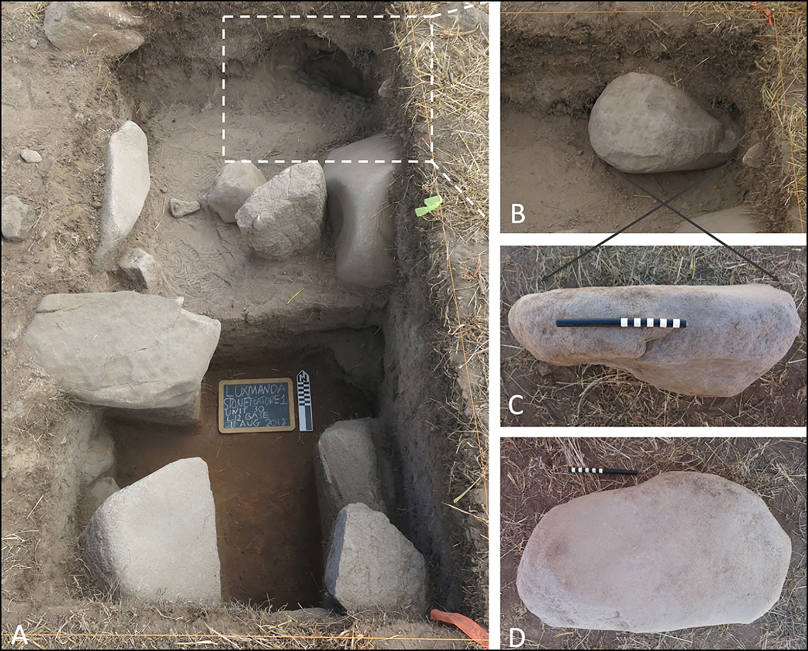 Figure 4. Excavation of units 29–30 (A), with details (B–D) of one lower grinding stone; photographs by K.M. Grillo.