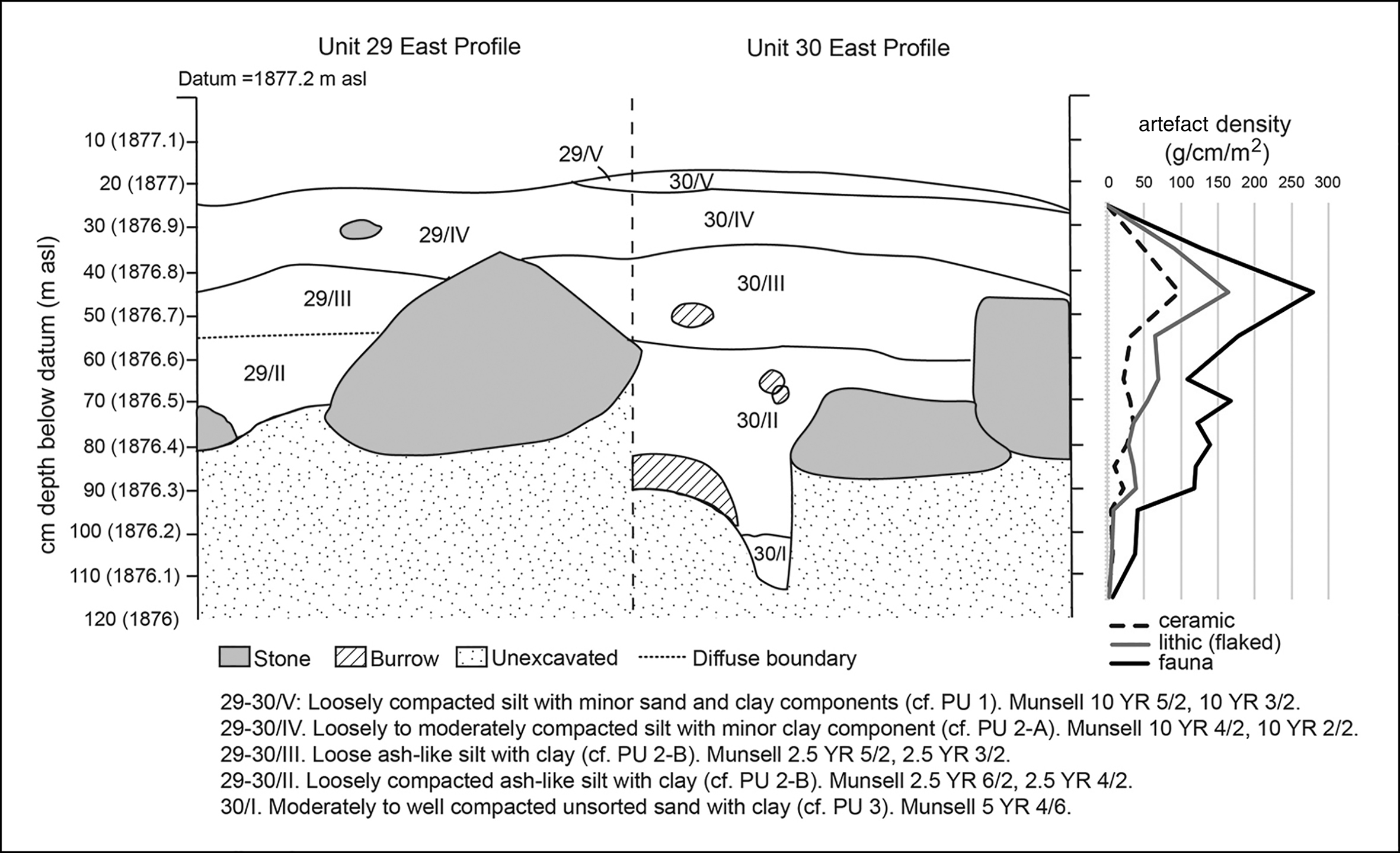 Figure 5. East profile of units 29–30, with artefact density by depth; PU refers to pedostratigraphic units; illustrations by M.E. Prendergast.