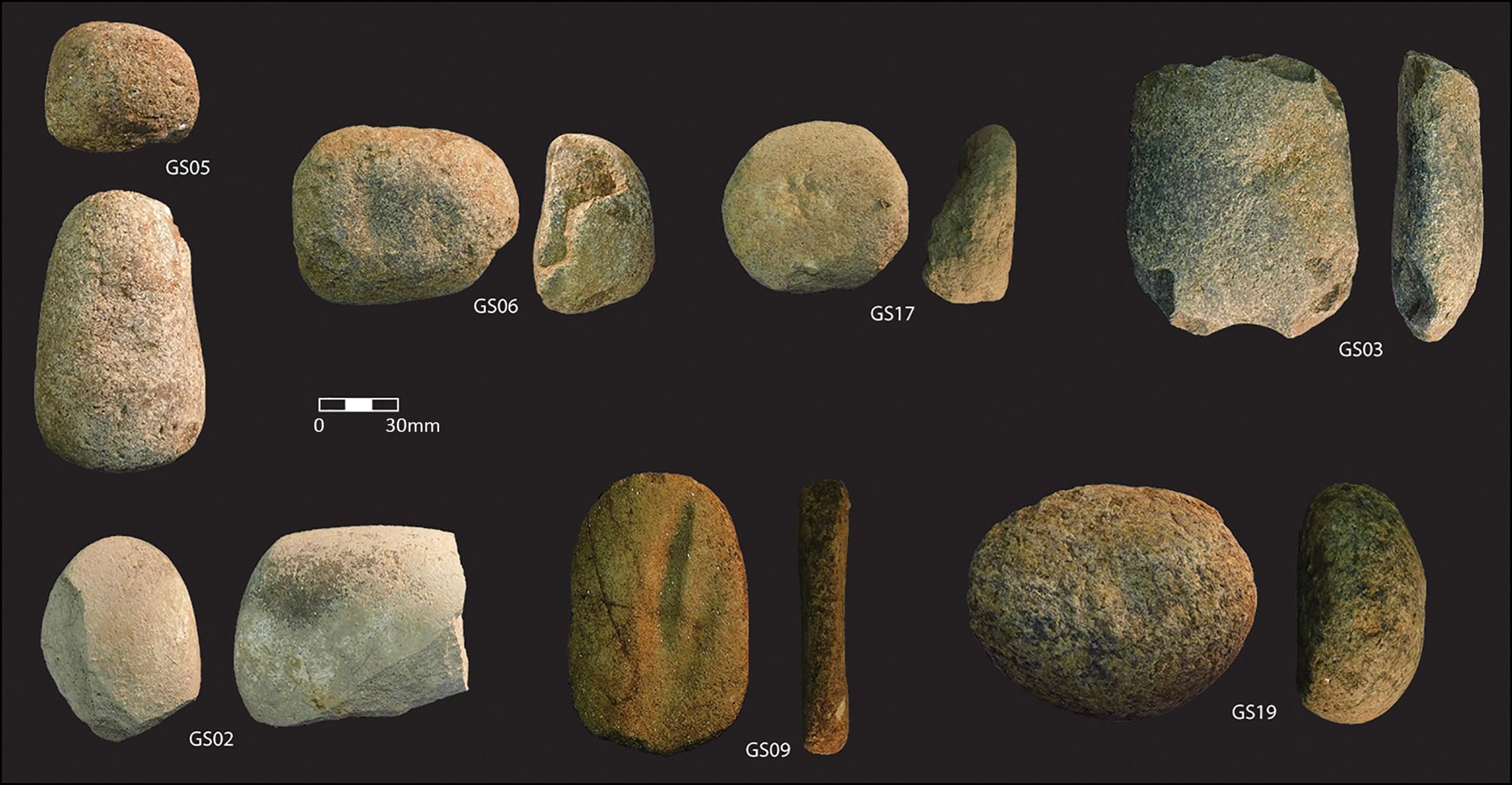 Figure 6. Examples of Luxmanda groundstone artefacts with two views of each; photographs by K.M. Grillo.