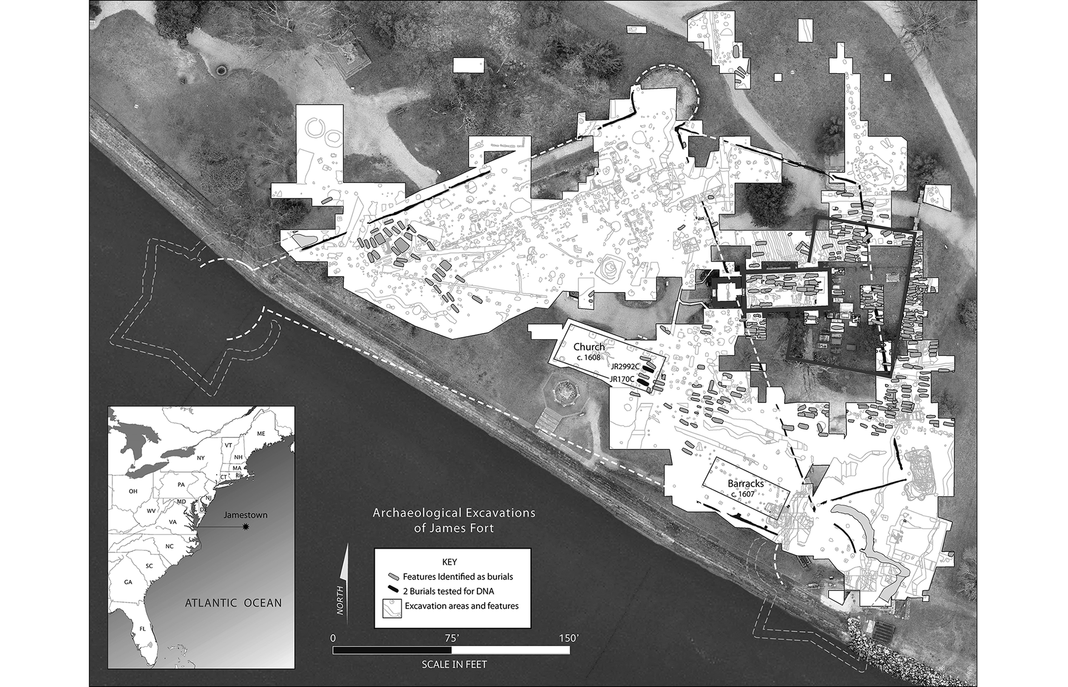 This research was sponsored by the Rice Family Foundation, with special thanks to Edward Rice; the Jamestowne Society under Governor Thomas B. Leitch and Executive Director Bonnie Hofmeyer; and the Kathryn Nell Harrison Foundation. Ancestry.com sponsored genealogical research on Ferdinando Wenman and William West by Gordon L. Remington of Progenealogists as arranged by Brock Bierman. Éadaoin Harney was supported by a grant from The Max Planck-Harvard Research Center for the Archaeoscience of the Ancient Mediterranean. The genetic analysis was also supported by grants from the National Institutes of Health (GM100233 and HG012287), the John Templeton Foundation (grant 61220), the Allen Discovery Center program, a Paul G. Allen Frontiers Group advised program of the Paul G. Allen Family Foundation, and by the HHMI.