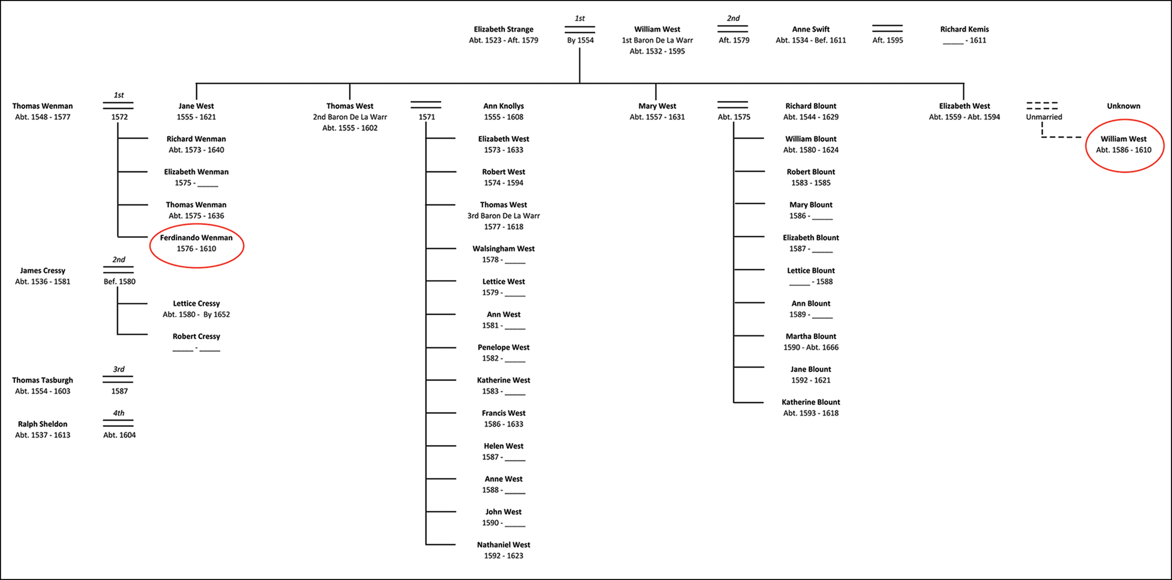 William West's specific relationship to Thomas West and to Ferdinando Wenman was unclear. William could not have been Thomas's nephew as none of his brothers were old enough to have had a child of William's age. He was not a brother and did not appear to be a cousin as Thomas's father, also called Thomas, the second Barron De La Warr, had only three sisters listed in the heraldic visitation from the period, and none were identified as mother to William (Rylands Reference Rylands and Rylands1913; Tyler Reference Tyler1924). His identification as a kinsman to Governor Thomas West thus denotes a relationship that was known at the time but has since been obscured by history.