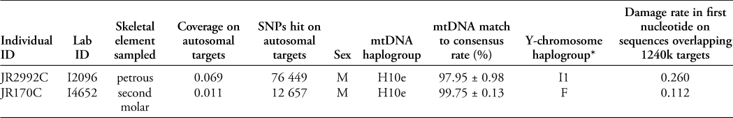 Genomic data were generated from the petrous portion of a temporal bone from JR2992C and a mandibular molar from JR170C (see OSM section 2, Table S3). Both skeletons exhibit relatively poor DNA preservation, with a total of 76 449 of the roughly 1.2 million targeted autosomal single nucleotide polymorphism (SNP) positions sequenced for individual JR2992C, and only 12 657 targeted SNPs sequenced for individual JR170C (Table 1). Despite poor DNA preservation, coverage was sufficient to assign both individuals to mitochondrial haplogroup H10e (Table S4; Weissenstiner et al. Reference Weissensteiner2016). The mitochondrial lineage H is commonly observed in much of west Eurasia, occurring at the highest frequencies in present-day Western Europe, where it accounts for more than 40 per cent of all mitochondrial DNA (mtDNA) lineages (Torroni et al. Reference Torroni, Achilli, Macaulay, Richards and Bandelt2006; Brotherton et al. Reference Brotherton2013). Within this lineage, the relatively rare haplogroup H10e has been observed in Europe in multiple ancient individuals, including two medieval individuals from Finland (Carvalho et al. Reference Carvalho2016; Översti et al. Reference Översti2019).