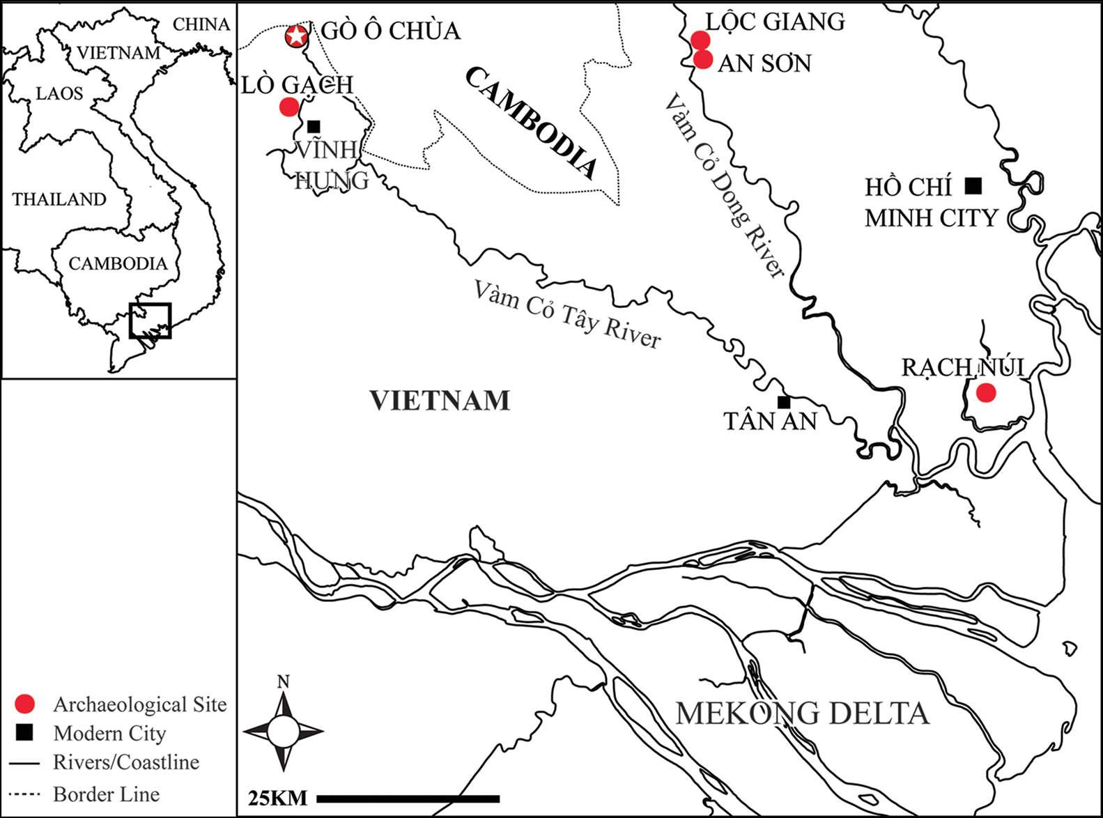 Go O Chua (meaning Pagoda Mound) is located in the lower Mekong Delta, in the Vam Co Tay River basin, within Vinh Hung District, Long An Province (11°00′18″N, 105°46′18″E). The site lies approximately 100km west-northwest of Ho Chi Minh City, and some 140km from the modern coastline (Figure 1). Go O Chua is a burial and settlement site defined by three mounds—the northern, central and southern mounds—extending some 450m in length, with a maximum width of 150m, giving a total area of approximately 65 000m2 (Vương Reference Vương2008: 17) (Figure 2). Various local and international teams investigated the site between 1997 and 2008, cumulatively excavating some 280m2 (Ngô & Bùi Reference Ngô and Bùi2001; Bùi et al. Reference Bùi, Reinecke, Nguyễn and Văn2004; Đặng et al. Reference Đặng, Võ and Văn2008). This makes Go O Chua one of the most extensively excavated sites in southern Vietnam.