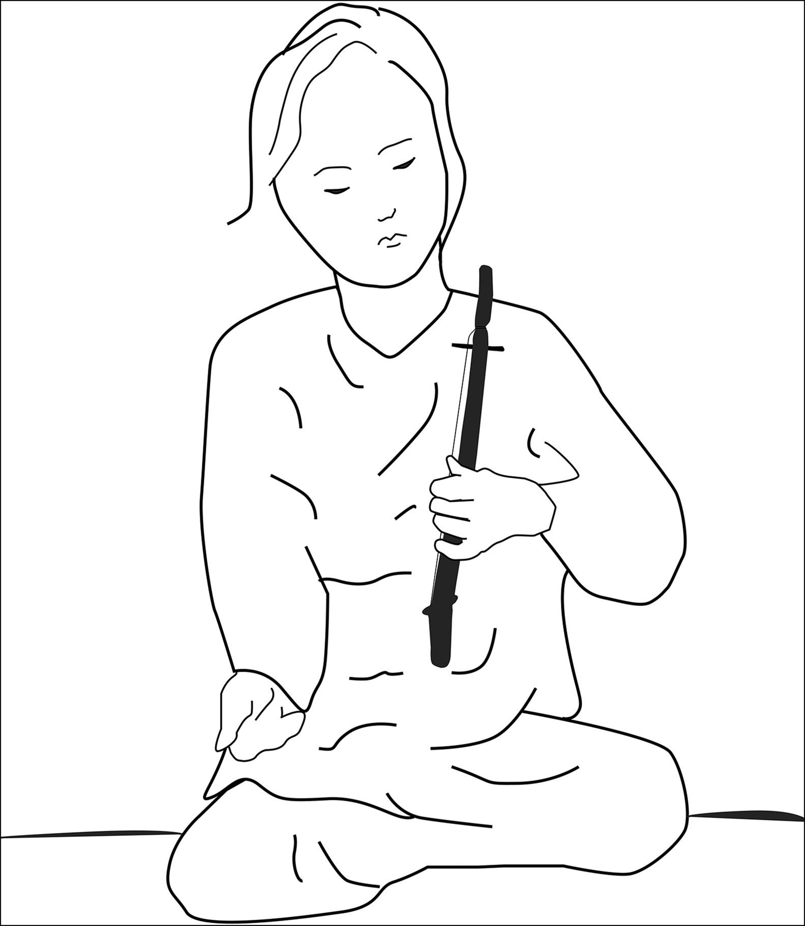 These ethnographically observed instruments are just a few among many other traditional chordophones in the region that are similar with the artefacts discussed here. Although the artefacts from Go O Chua could have been played in a multitude of ways, a possible set-up for Artefact 1 is presented in Figure 10, based on the ethnographic analogies discussed above. Traditional musicians typically sit either on the floor or on a chair, while the instrument is held close to the player's body. A resonator could be added, in a manner similar to the chest-resonated monochord described by Malm (Reference Malm1967: 130) as phin nam tao or phin pia—a stick zither from Thailand. The manufacture of these antler instruments would have required technical know-how and precision; indeed, as well as experience with specialised craft skills, we might also expect an understanding of music—perhaps the manufacturers were musicians themselves.