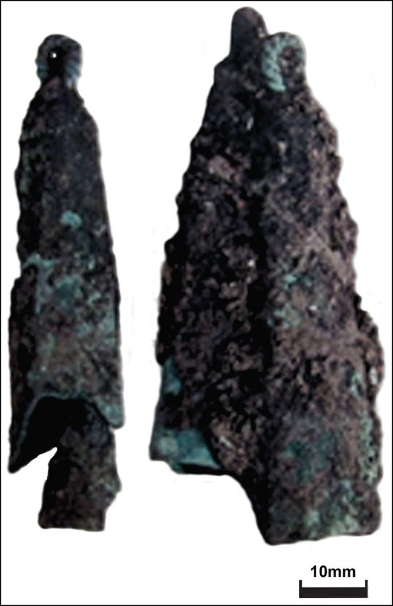 Three identical bronze bells were found in burial contexts in Trench H1 during the 1997 excavation (Figure 3). These bells are 90mm long, 26mm wide and 16mm deep (Vương Reference Vương2008: 36). All three were cast from the same mould type and have small, perforated suspension loops. They are comparable to bells from Lang Vac (Dong Son Culture), Prohear (Cambodia) and Zhouyuan (China) (Trinh & Nguyen Reference Trịnh and Nguyễn2001; Reinecke, et al. Reference Reinecke, Laychour and Sonetra2009; Campbell Reference Campbell2014).