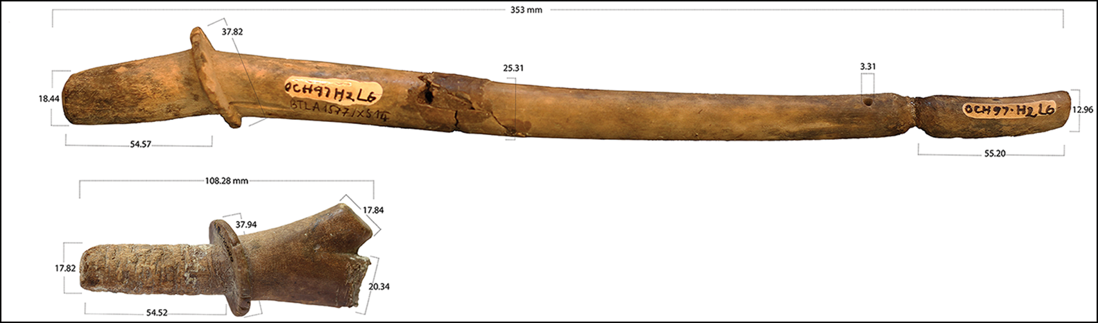In-depth analyses of the antler artefacts were conducted between 2012 and 2016 during visits to Long An Museum in Tân An Province. In addition, Jennifer R. Hull (Reference Hull2018, Reference Hull, David and Hmrčiarikin press) has examined more than 600 osseous artefacts from the Neolithic settlements of An Son, Rach Nui and Loc Giang (c. 4000–3200 cal. BP), as well as the Metal Age sites of Go O Chua and Lo Gach (c. 3000 cal BP) (locations on Figure 1). Most of these artefacts were identified as arrowheads, points, adzes, fishing implements and parts of weaving looms. None even remotely resemble the two antler artefacts discussed here.