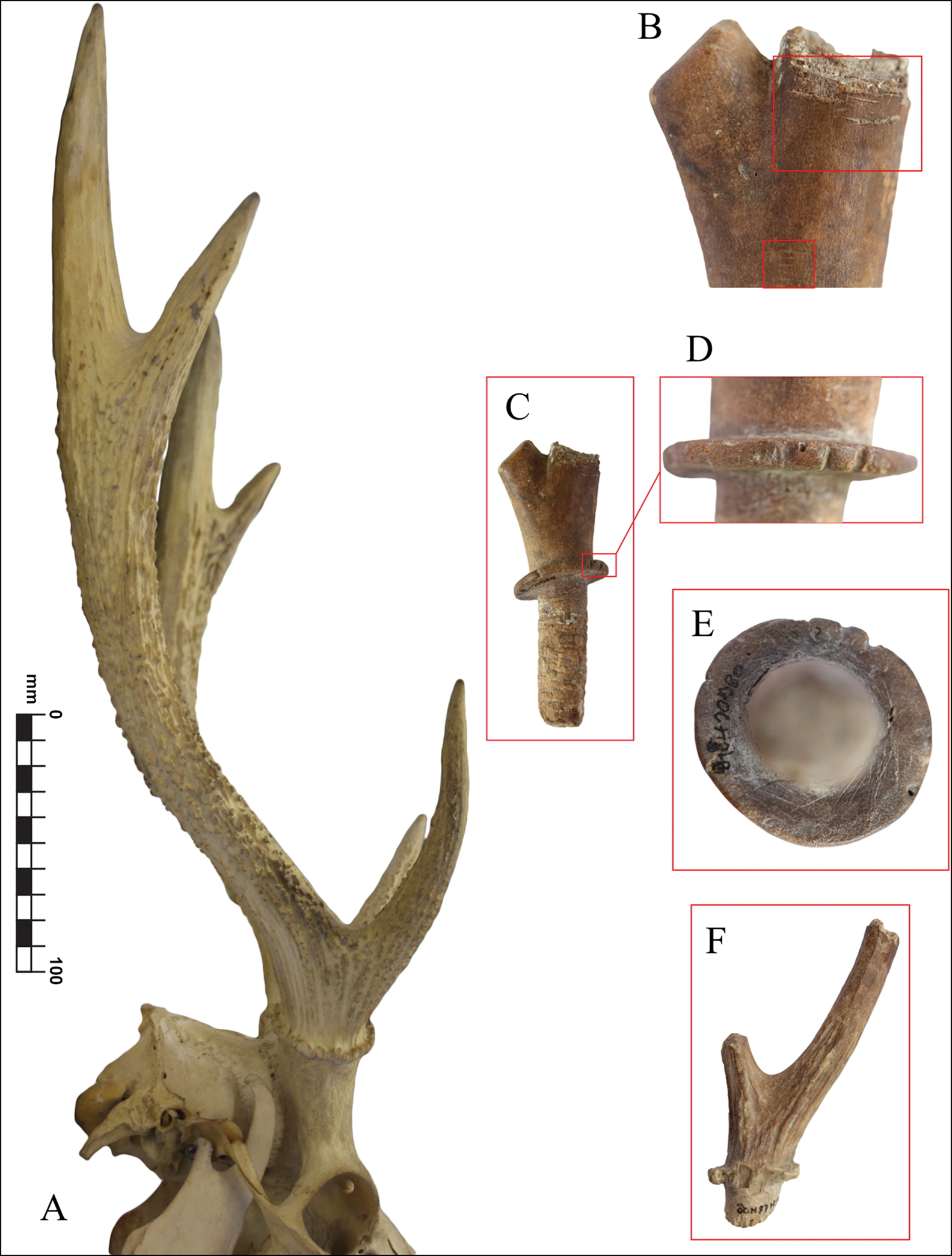 Figure 8. A) Modern skull of a Sambar deer (Rusa unicolor) (courtesy of the Australian Museum, Sydney); B–E) Artefact 2 (C), with details of manufacture and use-wear; F) antler pre-form recovered from the site in 2008 (illustration and photographs by J.R. Hull).
