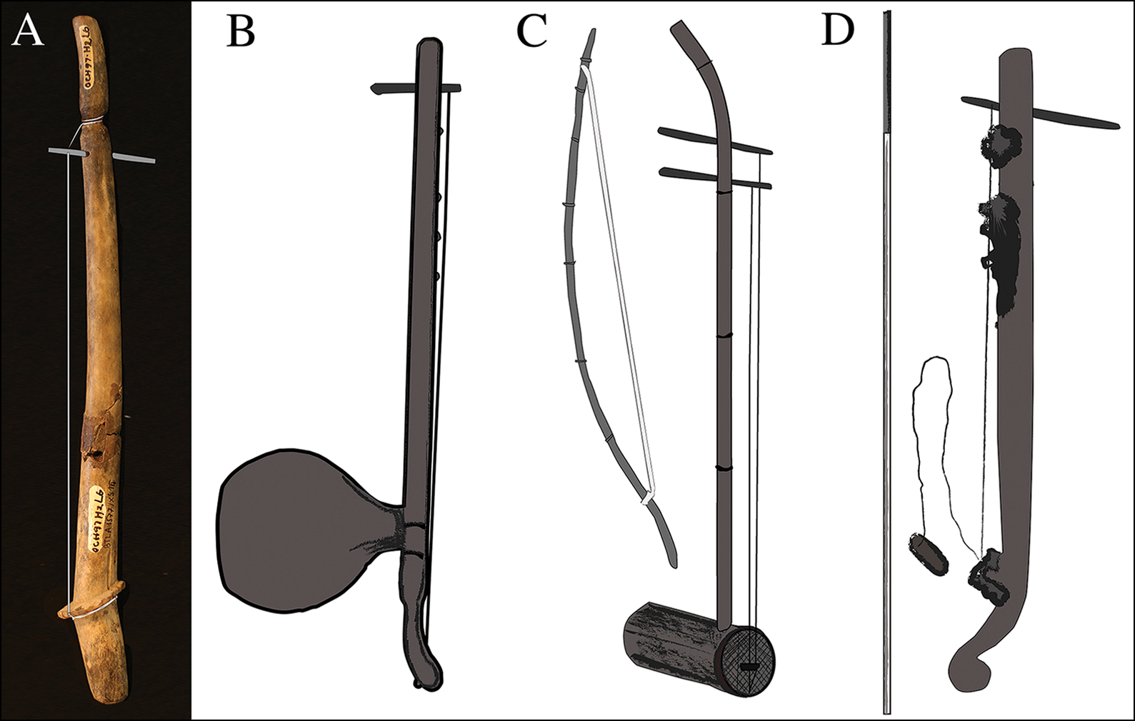The K'ny is a bowed monochord and is a uniquely Vietnamese instrument that is common among the Bahnar, Jo Rai, Se Dang and Ro ngao of northern and central Vietnam (Figure 9D). This instrument has a bridge and a hole at the distal end for a wooden tuning peg (which would fit the hole observed on Artefact 1) and has no resonator. The vibrating string was formerly made from spun wild palm or pandanus fibre but today is made of industrial metal wire. The instrument's length varies between 400 and 700mm, while the diameter of the neck is approximately 20–30mm.