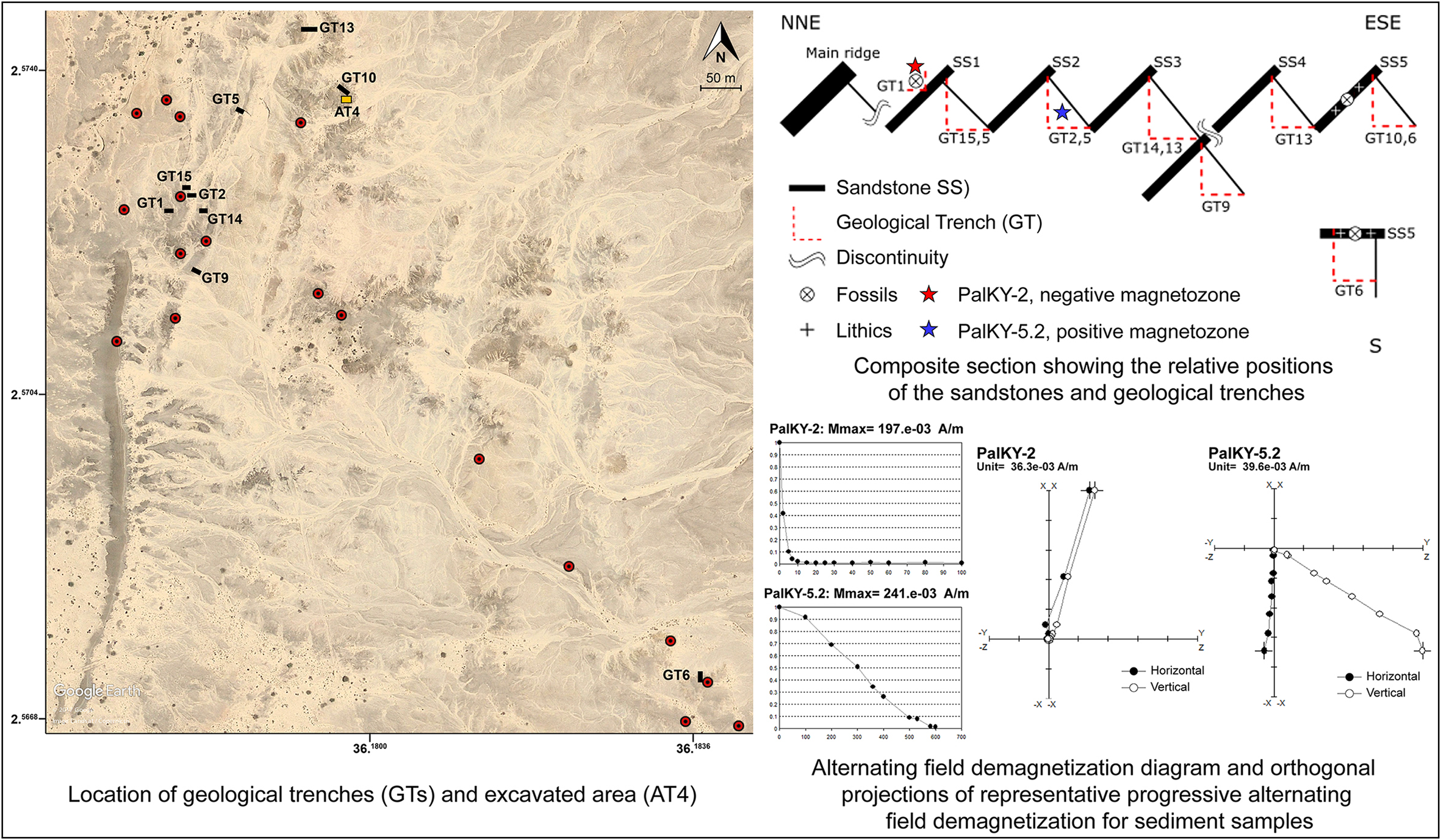 Palaeomagnetic analyses indicate a reverse magnetozone for sediments from GT1 (PalKY-2, above SS1), and a normal magnetozone for sediments from GT2 (PalKY-5.2, below SS2) (Figure 2).