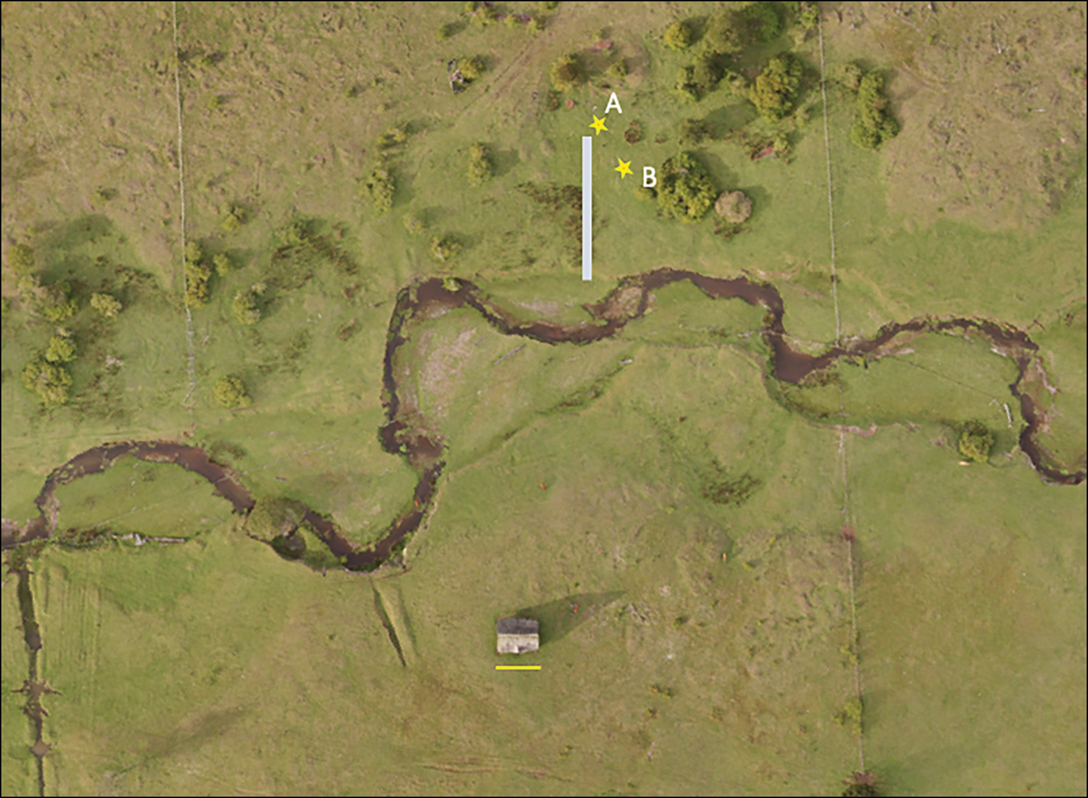Figure 2. A) Location of the core analysed by Taylor; B) position of the Pino core (MV-86b). The pale grey line (65m long) represents the position of a previously studied stratigraphic section to the north of Chinchihuapi Creek (between sections CS and 31; Pino Reference Pino and Dillehay1989). The lower half of this line is located in the MV-II site, situated approximately 40m from the two cores. The yellow scale line in front of the house measures 12m (figure by M. Pino).