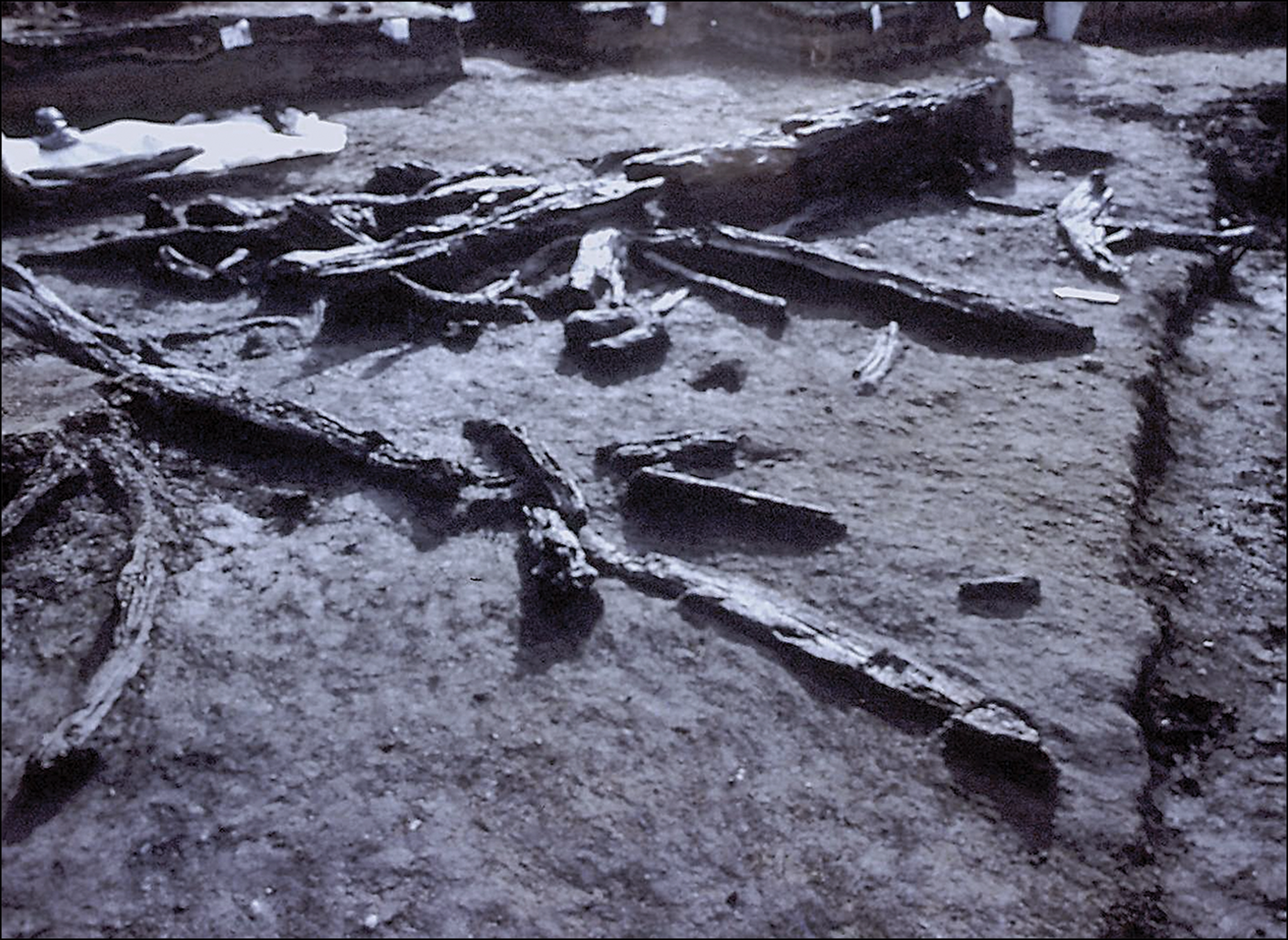 Figure 3. Part of the collapsed wooden frame and foundation timbers of a section of the long, internally segmented tent-like structure at MV-II. The internal segments are defined by tree branches staked and tied in place. Note the darkened floor of the structure, which contains moderately high quantities of ash, charcoal, plant and animal remains, and other debris (photograph by T. Dillehay).