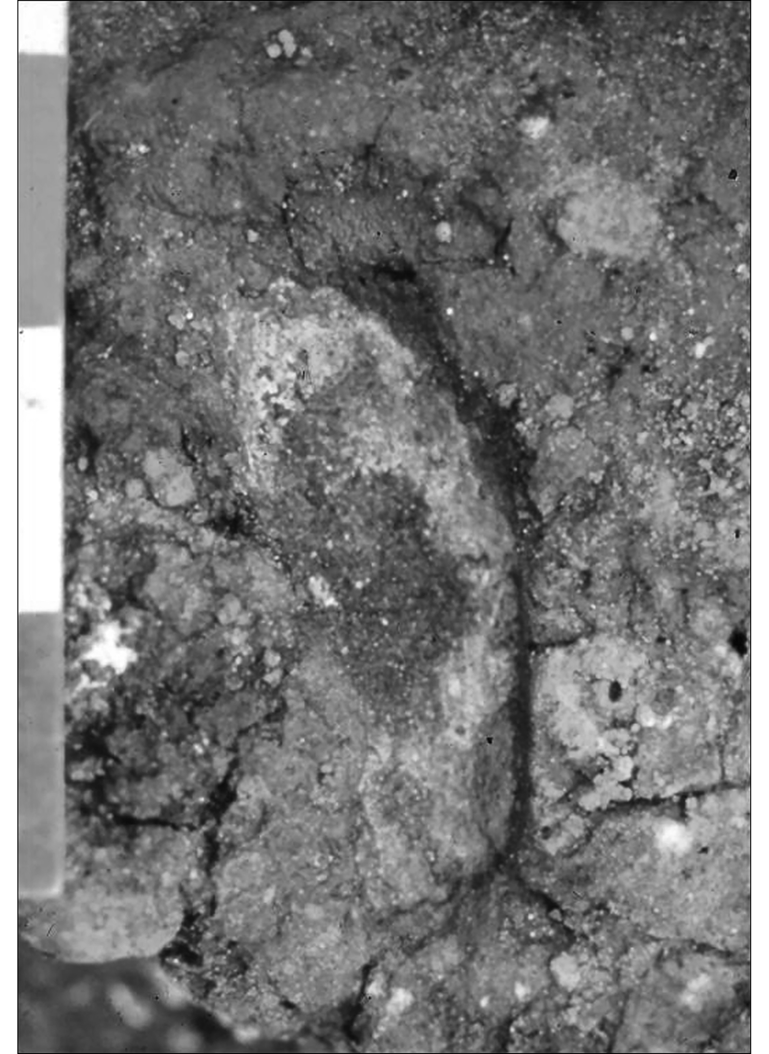 Figure 4. One of three human footprints on the cultural use-floor of MV-II. Note the clear impression of the toes and heel. Scale in 100mm increments (photograph by T. Dillehay).